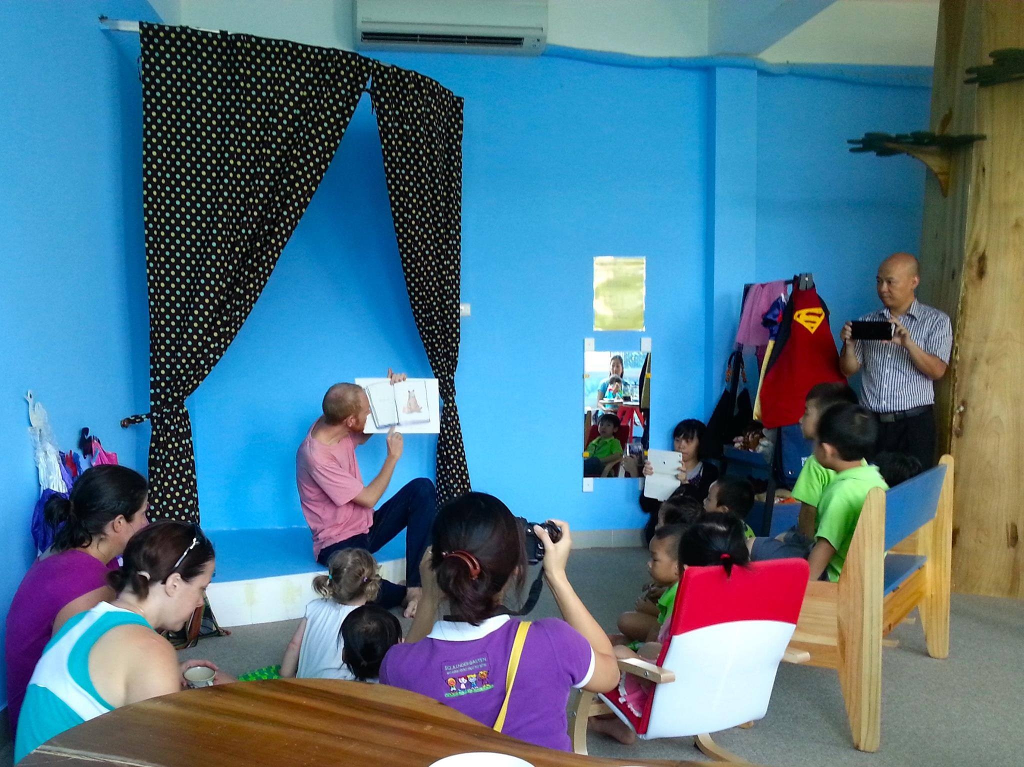 | Thời gian các phụ huynh Tây, Việt cùng con nhỏ nghe thầy giáo nước ngoài kể chuyện. Ảnh: NVCC. |