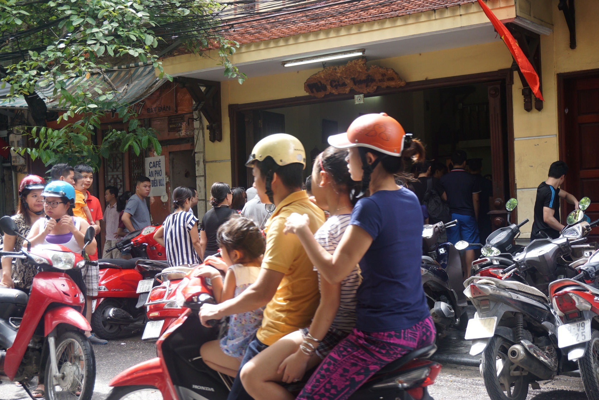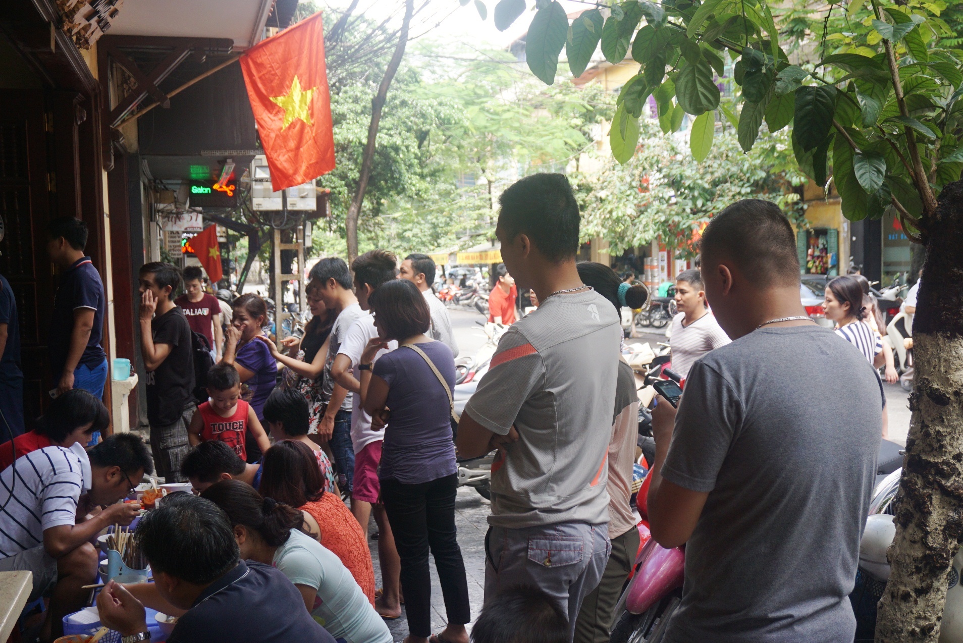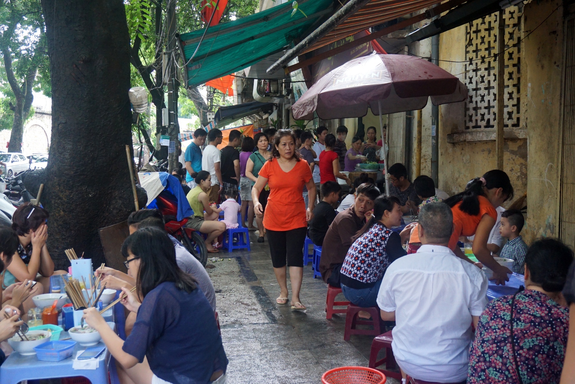 Khách ngồi kín chỗ dọc hai bên đoạn vỉa hè trước quán. Những người đến sau phải xếp hàng để mua, phải chờ khách trước ăn xong mới có chỗ ngồi.