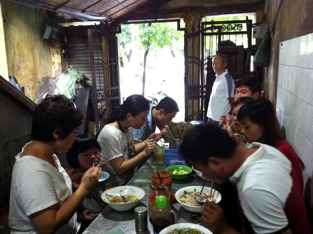 8h sáng, trời khá nắng, nóng nhưng nhiều khách sẵn sàng đứng dưới nắng xếp hàng vì sợ đi thì mất chỗ. Khách xếp thành hai hàng ngang - dọc để vào quán. Vỉa hè chật hẹp, bên trong quán lại nhỏ nên thực khách tới đây thường ăn nhanh để nhường chỗ cho các khách đến sau. Nhiều khách phải chờ cả tiếng đồng hồ vừa xếp hàng, vừa đợi chỗ mới được thưởng thức bát phở 50.000 đồng.