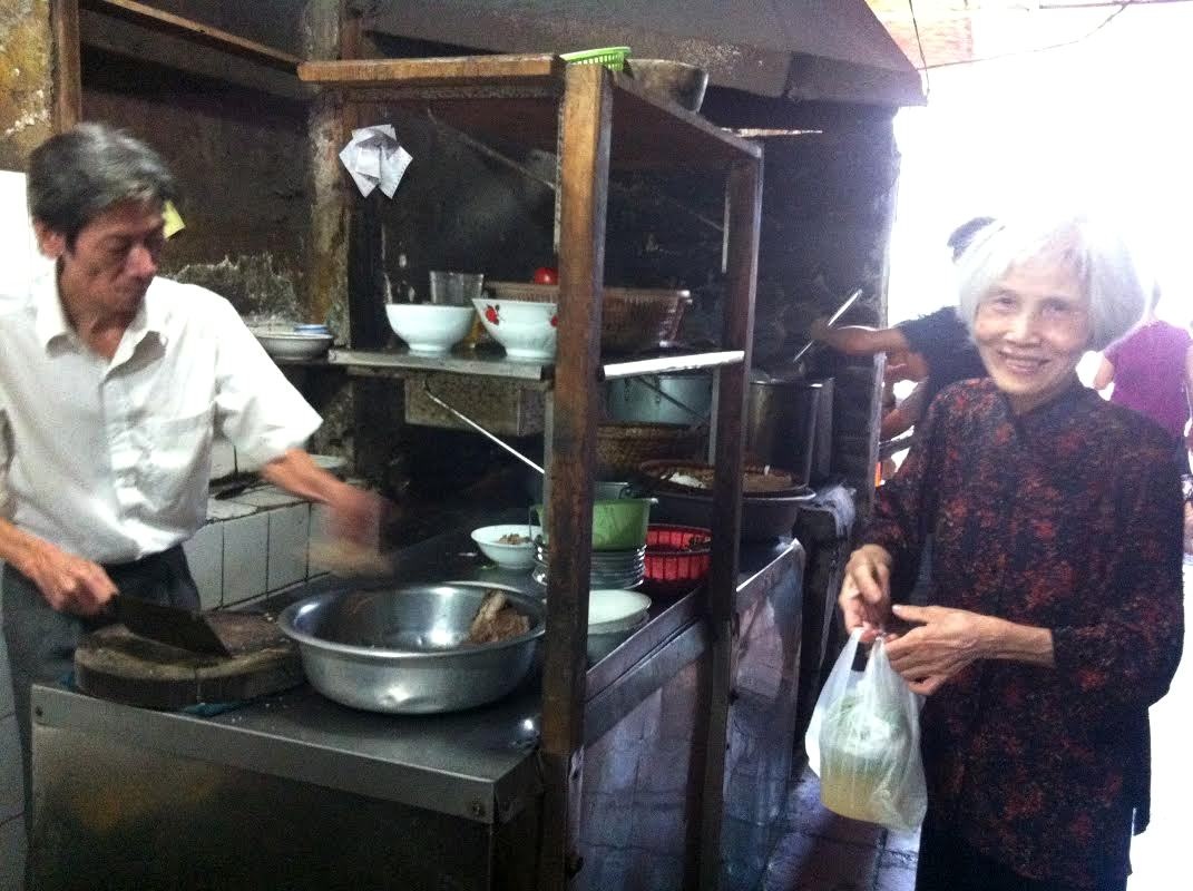 Cụ khách hàng này năm nay đã 90 tuổi, nhà ở phố Trần Phú (quận Ba Đình, Hà Nội). Thi thoảng, cụ vẫn bắt xe ôm hoặc xe bus tới ăn phở theo thói quen từ ngày trẻ. Đúng ngày nghỉ lễ, cụ ông ở nhà mong muốn được thưởng thức món khoái khẩu nên cụ bà lặn lội đường đông lên bờ Hồ mua phở cho chồng. Tuy nhiên, quán quá đông, lại hết hộp đựng nên lúc đầu, chủ quán từ chối bán cho cụ vì sợ nước phở quá nóng, đựng vào túi nylon sẽ không an toàn. Cụ ra sức thuyết phục: "Bằng giá nào chú cũng phải bán cho tôi một bát mang về cho ông ấy. Tôi thuê bát của quán đựng phở mang về cũng được, nhà tôi ăn xong tôi lại bắt xe mang bát tới gửi chú". Nể bà cụ tuổi cao, đường xa, chủ quán đành nhờ người tìm hộp đựng bán phở cho vị khách trung thành.