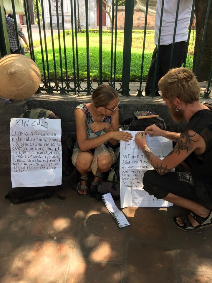 | Anh Tautvydas Urbelis (quốc tịch Lithuania) viết thông báo bị cướp tài sản tại văn miếu Quốc Tử Giám kêu gọi ủng hộ. Ảnh: Lê Thanh Thúy. |