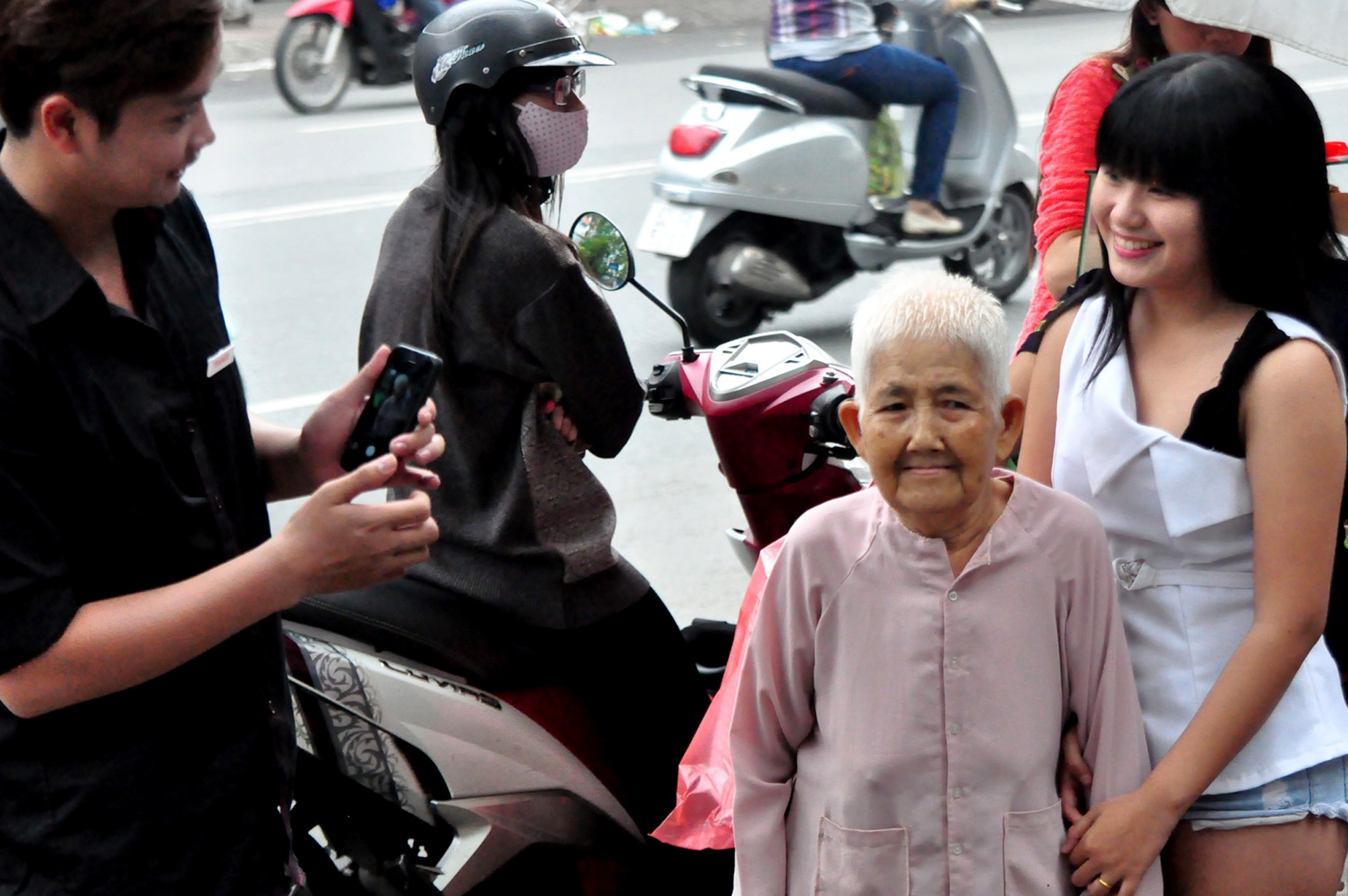 Khách mua còn tranh thủ chụp hình với cụ để làm kỷ niệm.