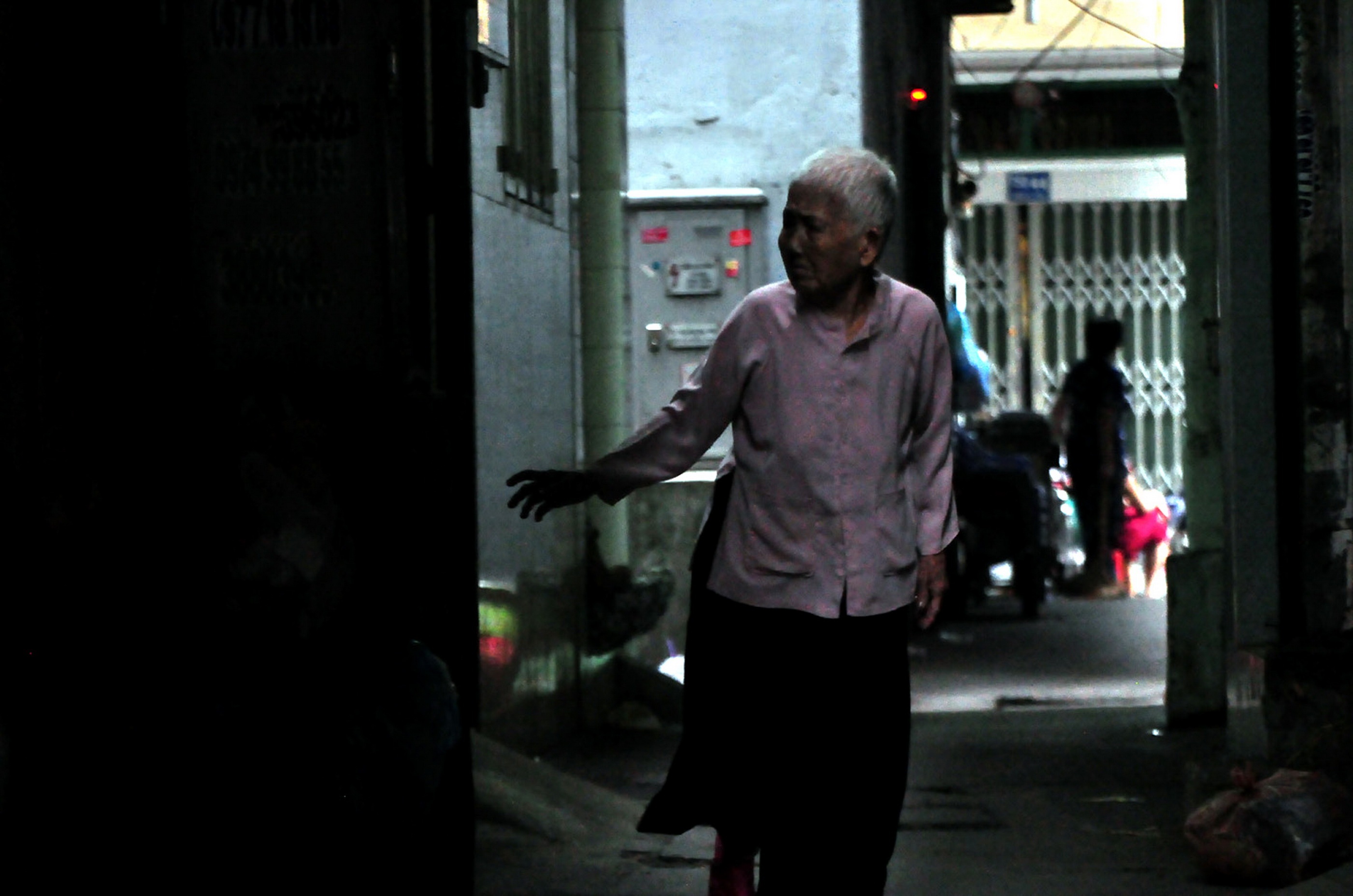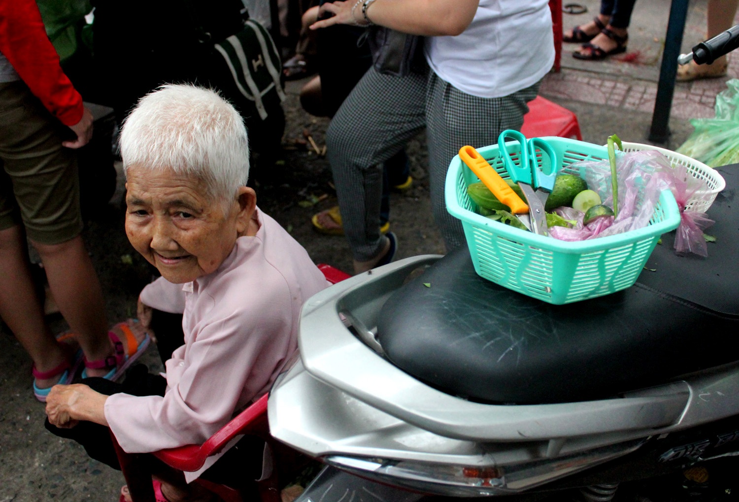Bà cụ 80 tuổi người gầy gò, tai không còn nghe được rõ, nhưng nhiều năm qua phải bươn chải với xe bún thịt nướng để nuôi con bệnh.