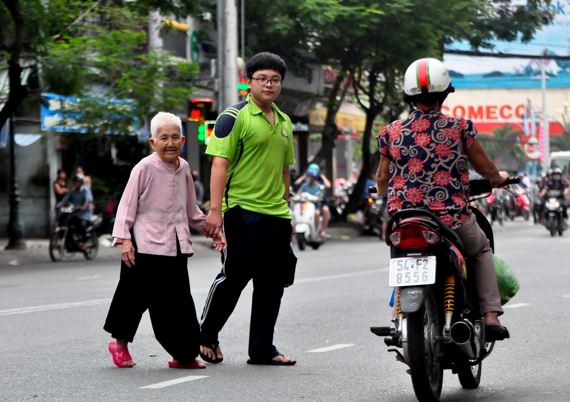 Xe bún của cụ Tám bán bên đường Lê Hồng Phong, quận 10, TP.HCM. Nhà cũng ở một con hẻm nhỏ trên đường này, nhưng từ nơi ở tới điểm bán, cụ Tám phải đi bộ băng qua đường lớn.