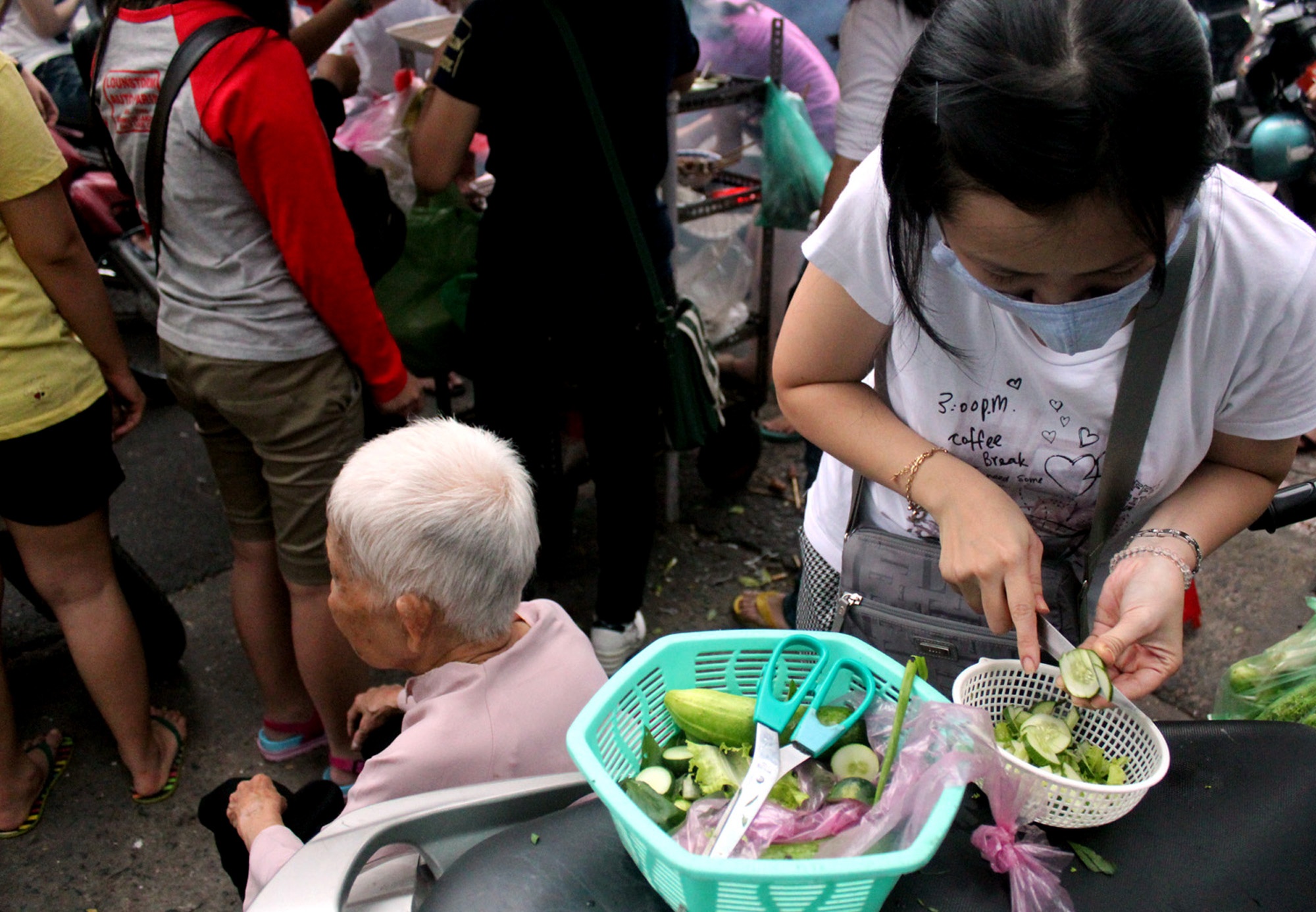 Không chỉ tìm đến mua hàng ủng hộ cụ Tám, những ngày vừa qua, khoảng 5h chiều, nhiều người không quen biết nhau cũng đã có mặt tại con hẻm 589 đường Lê Hồng Phong, quận 10 để giúp cụ bán bún thịt nướng.