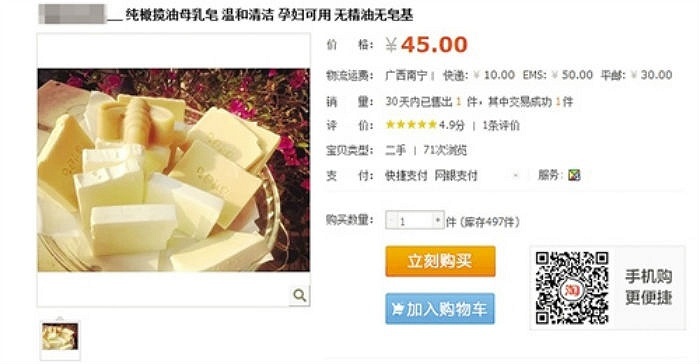 Tìm kiếm với từ khóa 'xà phòng sữa mẹ' trên trang bán hàng trực tuyến lớn nhất Trung Quốc, Taobao, cho ra hơn 3.000 kết quả.