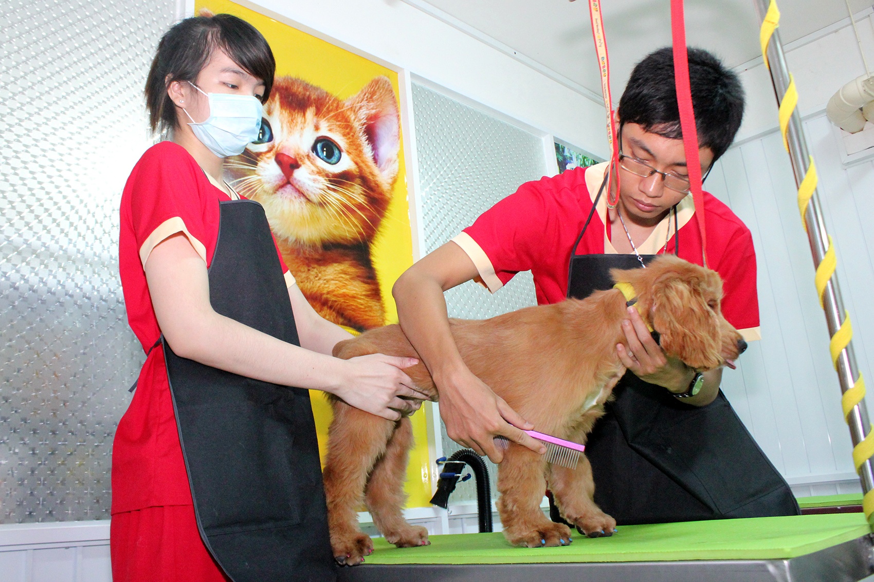 Phòng spa làm đẹp cho thú cưng, tất cả nhân viên đều mặc đồng phục, vệ sinh kỹ trước khi tiếp xúc với thú.