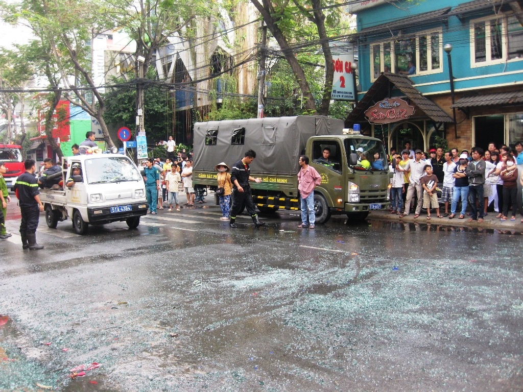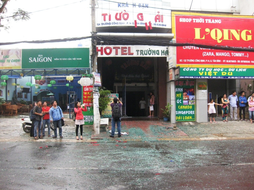 | Thời điểm trên, người dân phát hiện khói bốc ra ngùn ngụt từ tầng 3 của khách sạn Trường Hải (có một trệt, 4 lầu). Tiếp đó, ngọn lửa lan nhanh nên gây ra một tiếng nổ khá lớn. Toàn bộ phần kính trước tầng 3 bị vỡ văng tung tóe xuống đường. |
