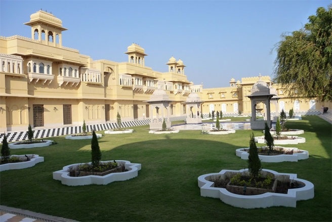 | Đặt chân tới khách sạn, khách sẽ nhìn thấy một kiến trúc lớn lấy cảm hứng từ những cung điện truyền thống ở bang Rajasthan của Ấn Độ. |