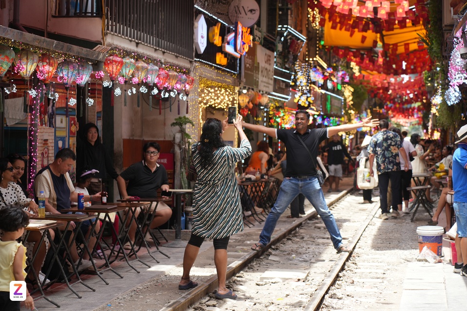 Du khách quốc tế trải nghiệm phố cà phê đường tàu Hà Nội, ngày 18/10. Ảnh: Trần Hiền. |