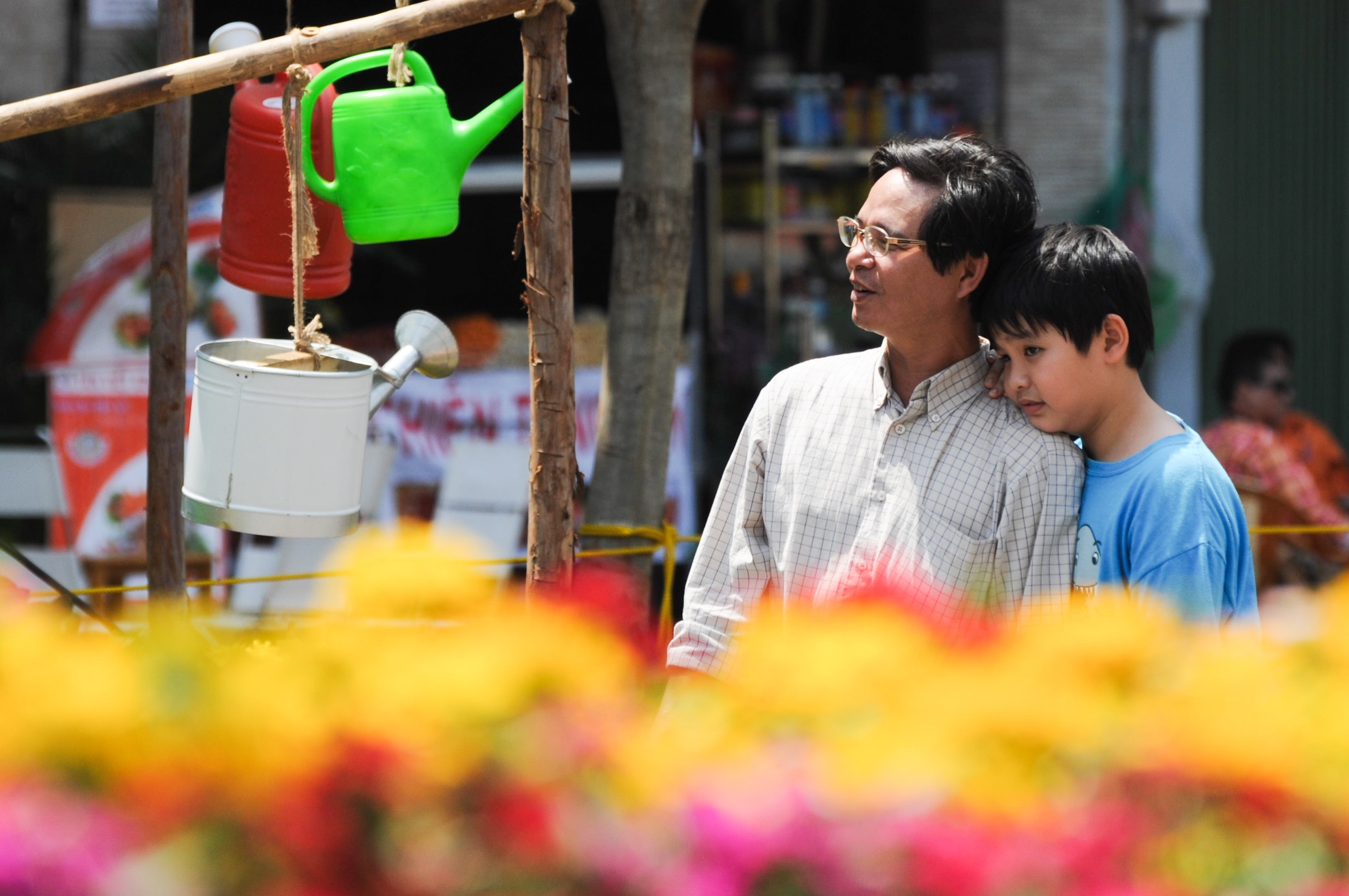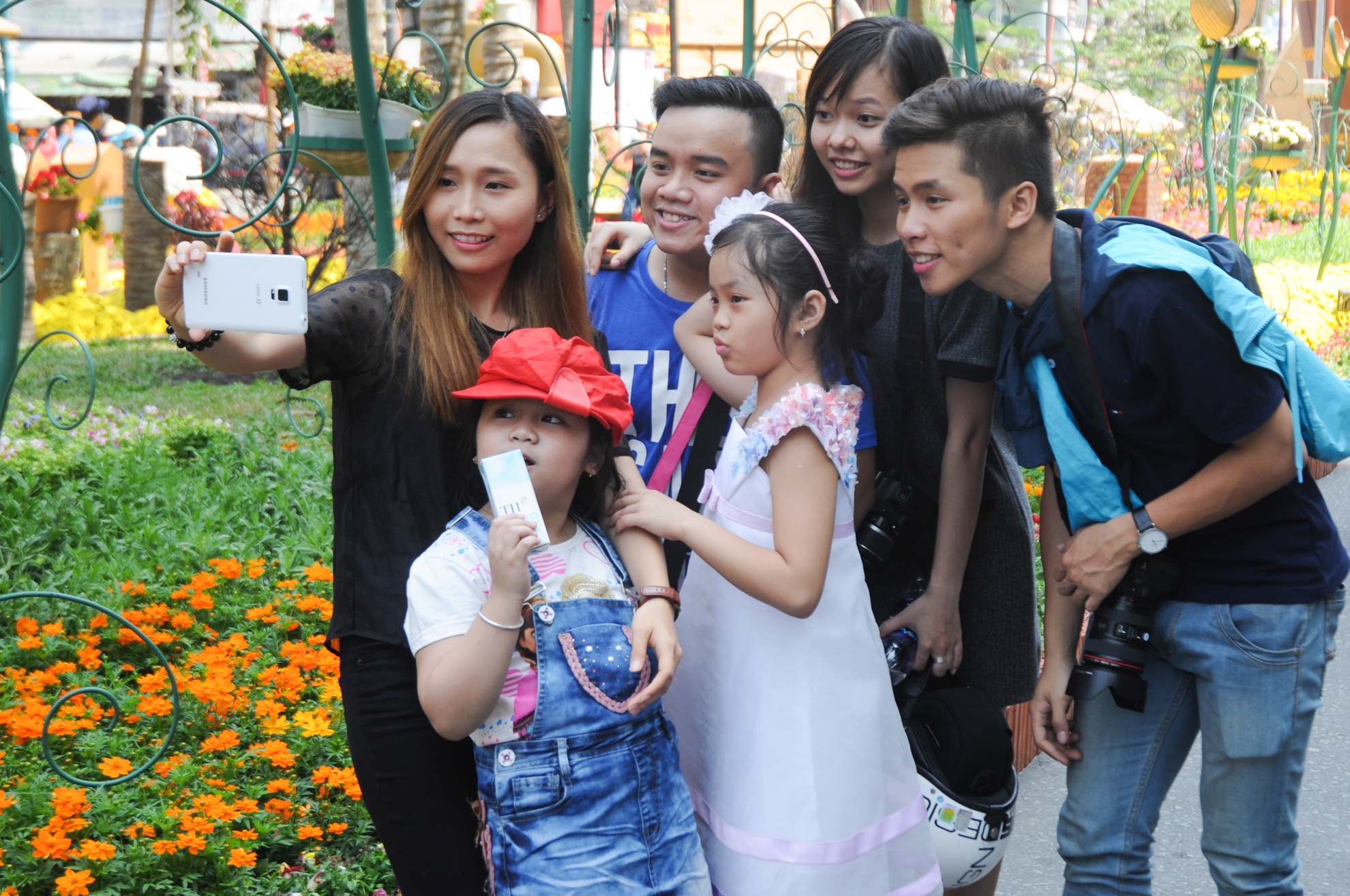| Ngoài nam thanh nữ tú thích thú đến tham quan, nhiều phụ huynh còn dẫn con em mình đến đường hoa. |