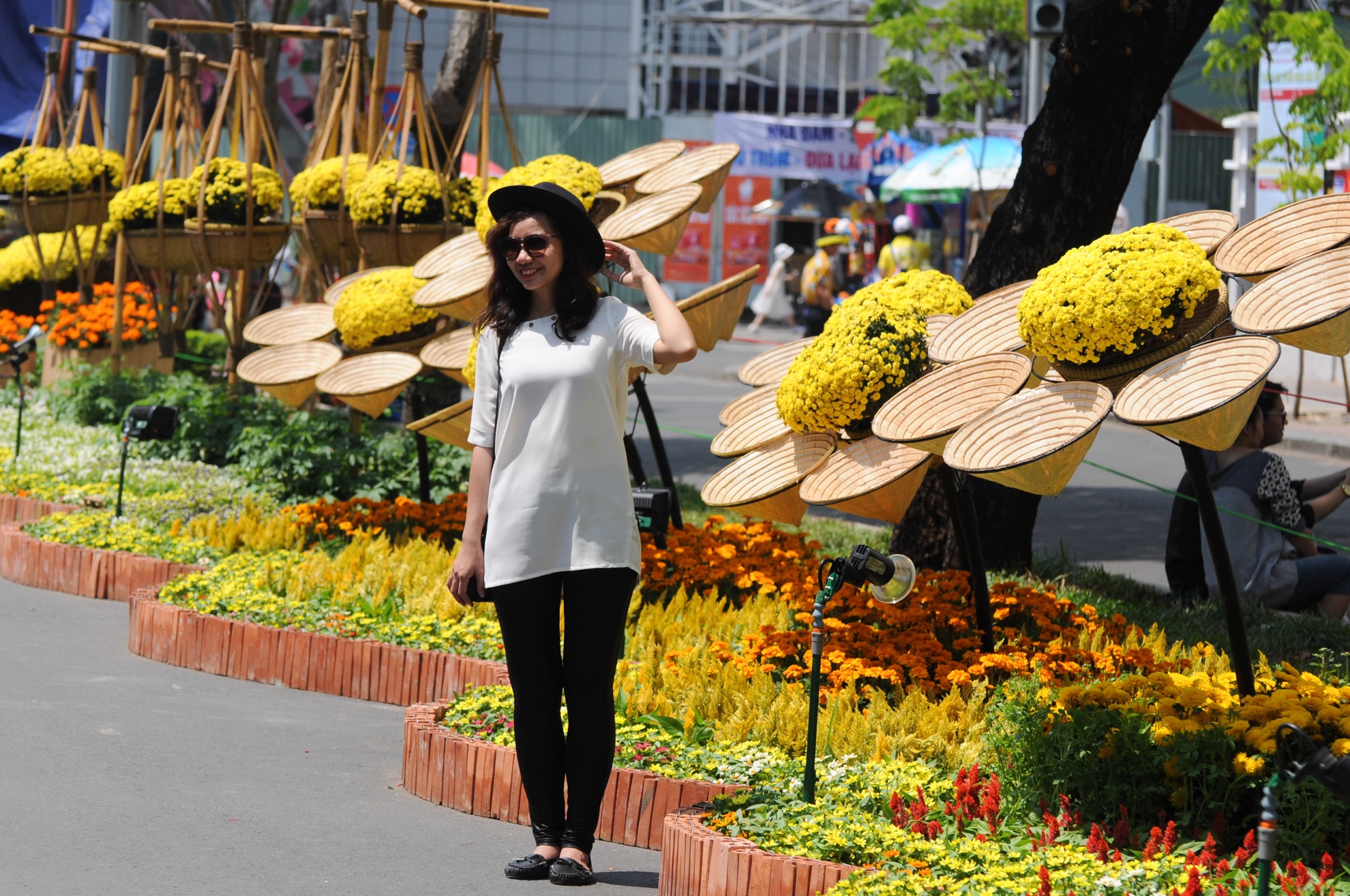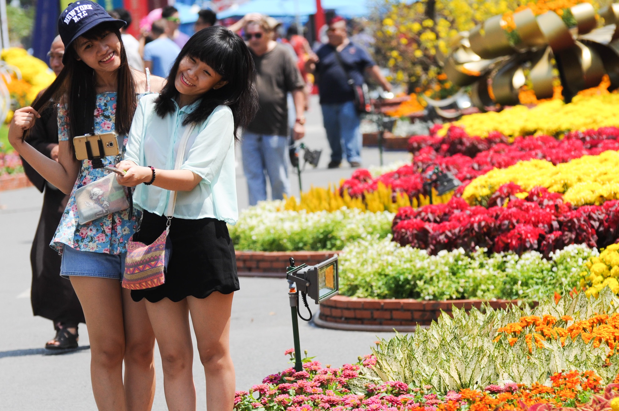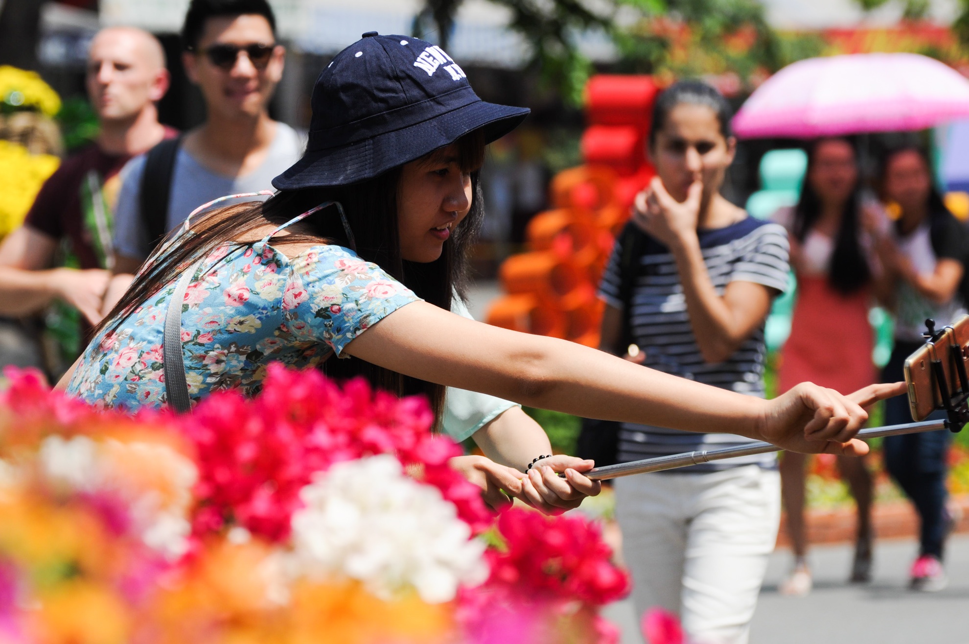 | Đường hoa xuân Ất Mùi thu hút khách du lịch nước ngoài đến thưởng ngoạn, vui chơi. Nhiều du khách bày tỏ sự hào hứng khi tạo dáng để chụp ảnh gửi cho bạn bè, người thân. |