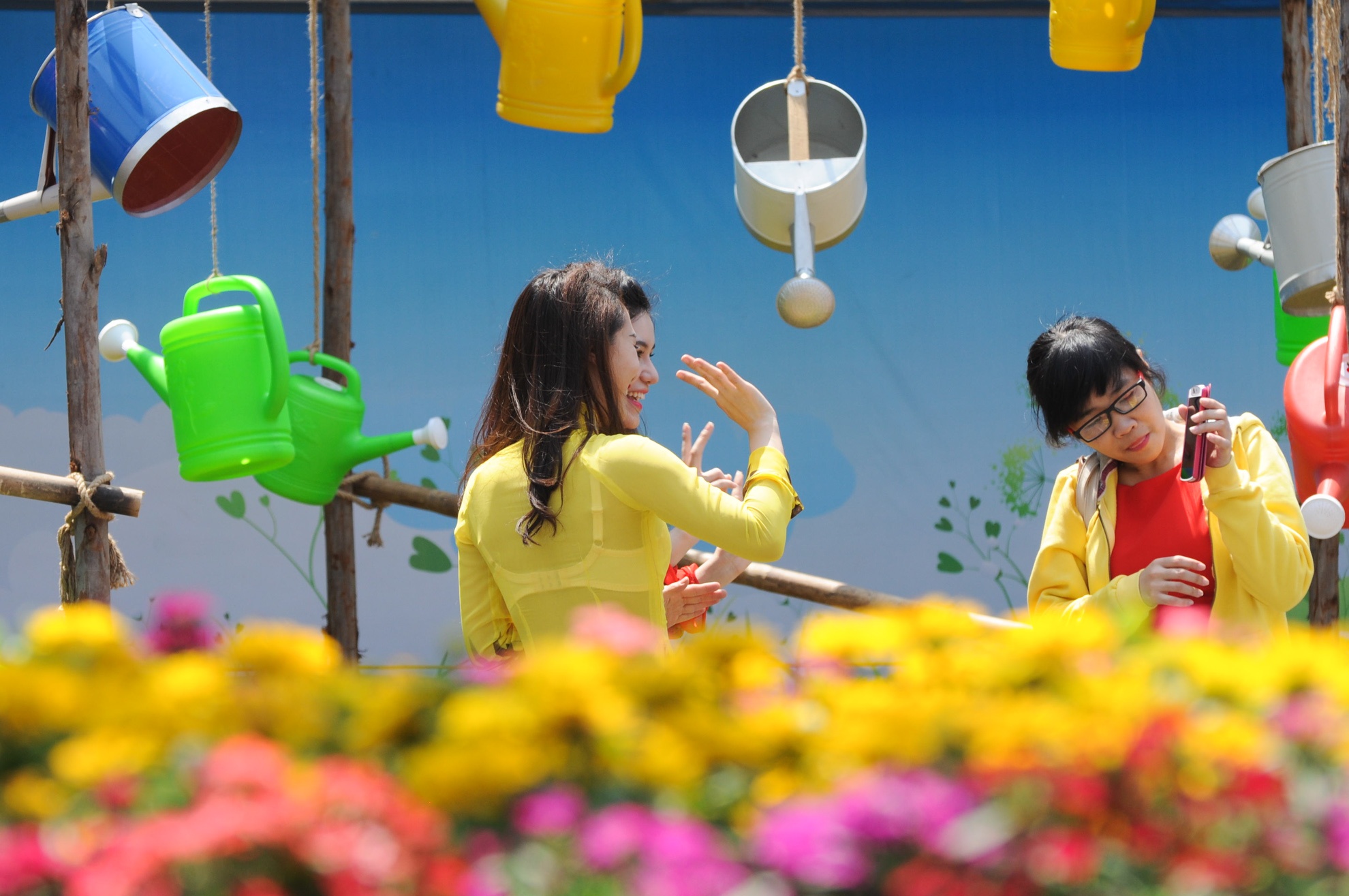 | Đường hoa năm nay thu hút đông bạn trẻ đến tham quan và chụp hình kỷ niệm. Họ vui đùa, nhảy múa bên những vườn hoa xuân màu sắc rực rỡ. |