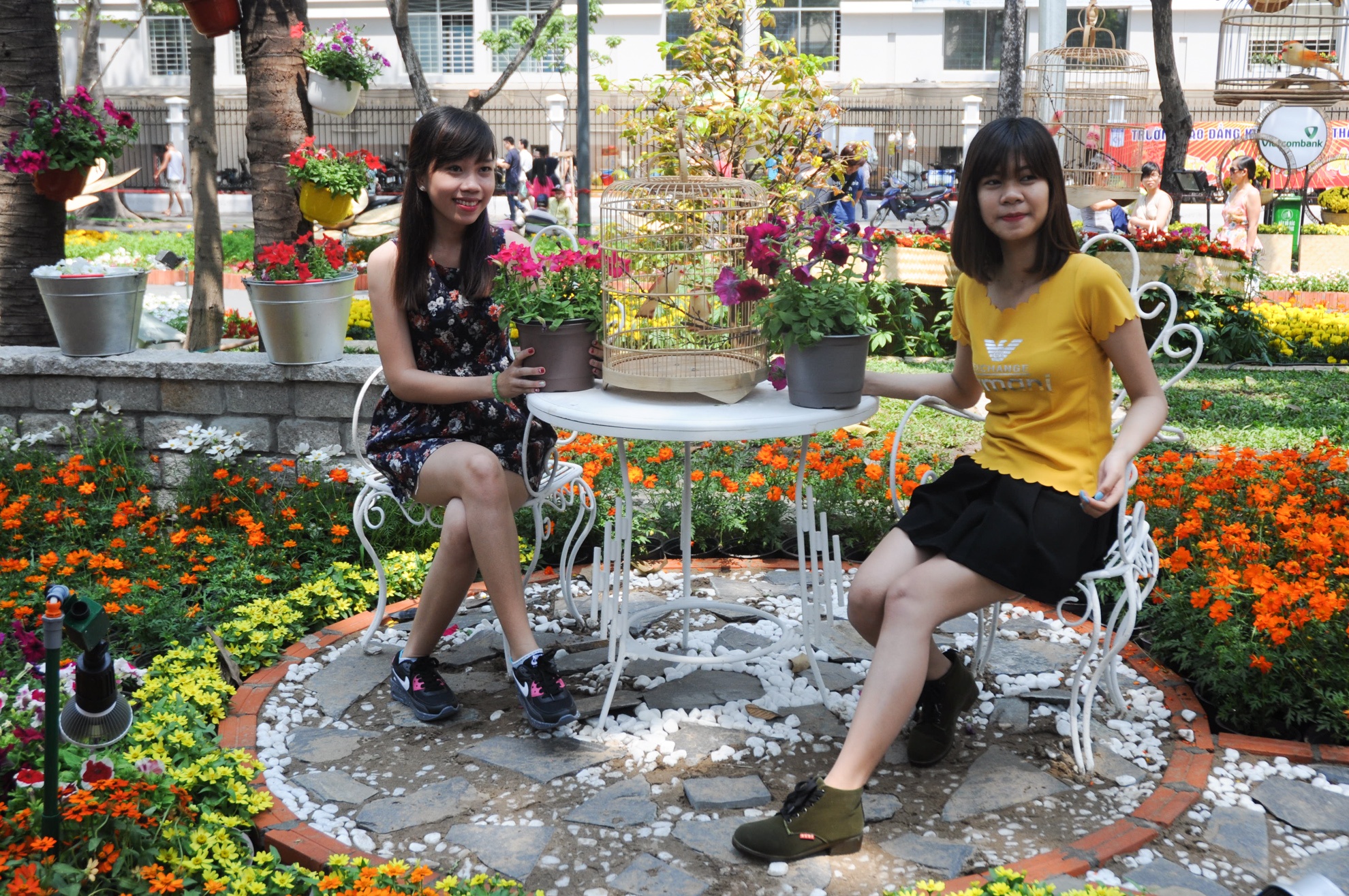 | Hai bạn nữ tạo dáng trên chiếc bàn đặt sẵn trong đường hoa giữatrưa 30 Tết. |