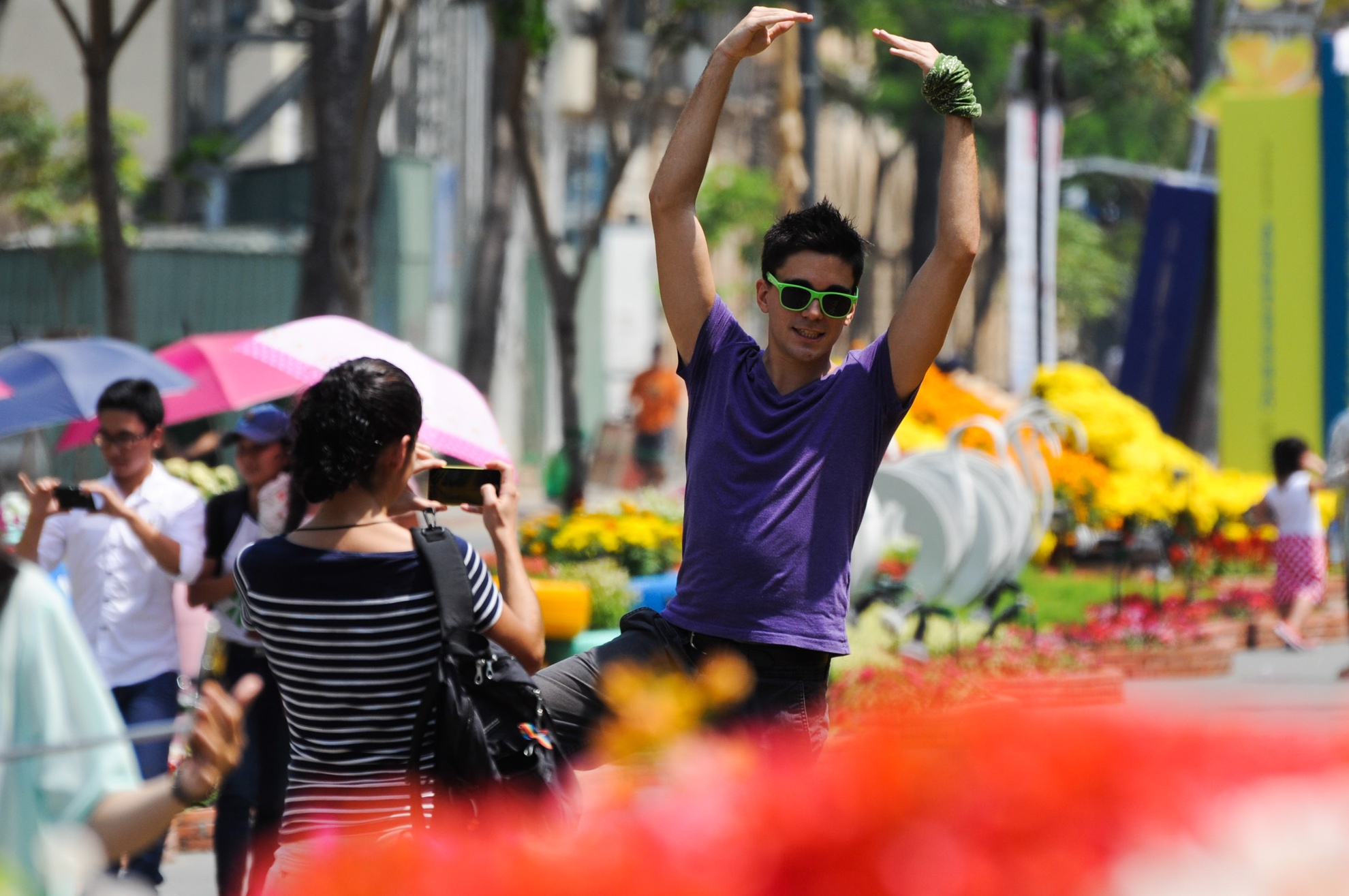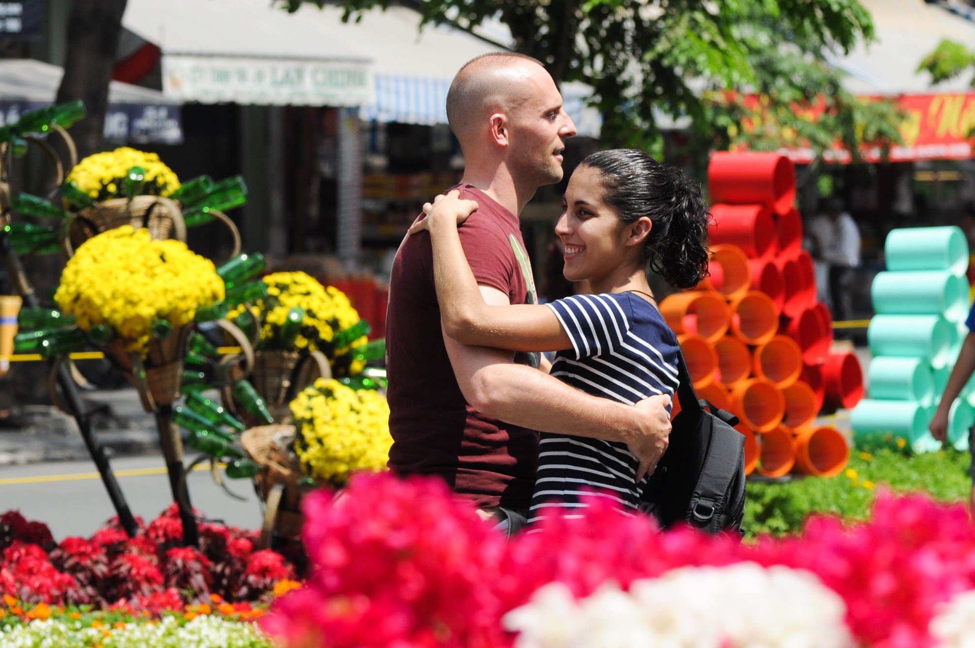 Nhiều du khách ở TP HCM đã đến thưởng ngoạn lễ hội đường hoa xuân. Hai vị khách trẻ tuổi khiêu vũ theo tiếng nhạc giữa con đường đầy hoa tươi giữa trung tâm thành phố.