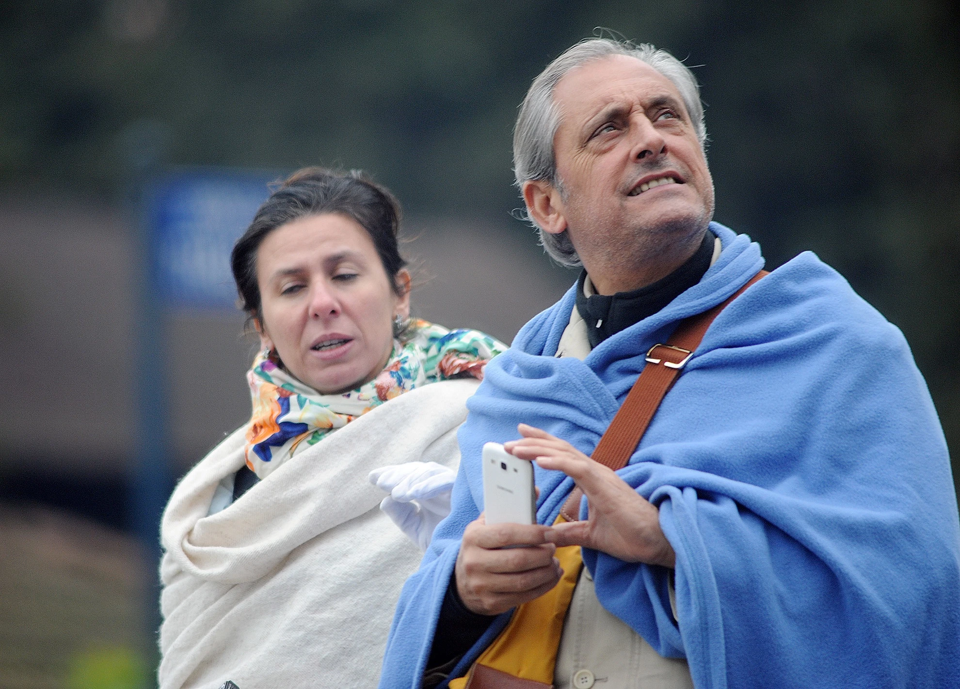 | Hai khách du lịch người Mỹ đến Sa Pa từ sáng nay nhưng họ không nghĩ khu du lịch này có thể lạnh 5 - 6 độ C nên không kịp mua áo ấm. Cả hai khoác tạm chiếc chăn lên người đi du ngoạn. |