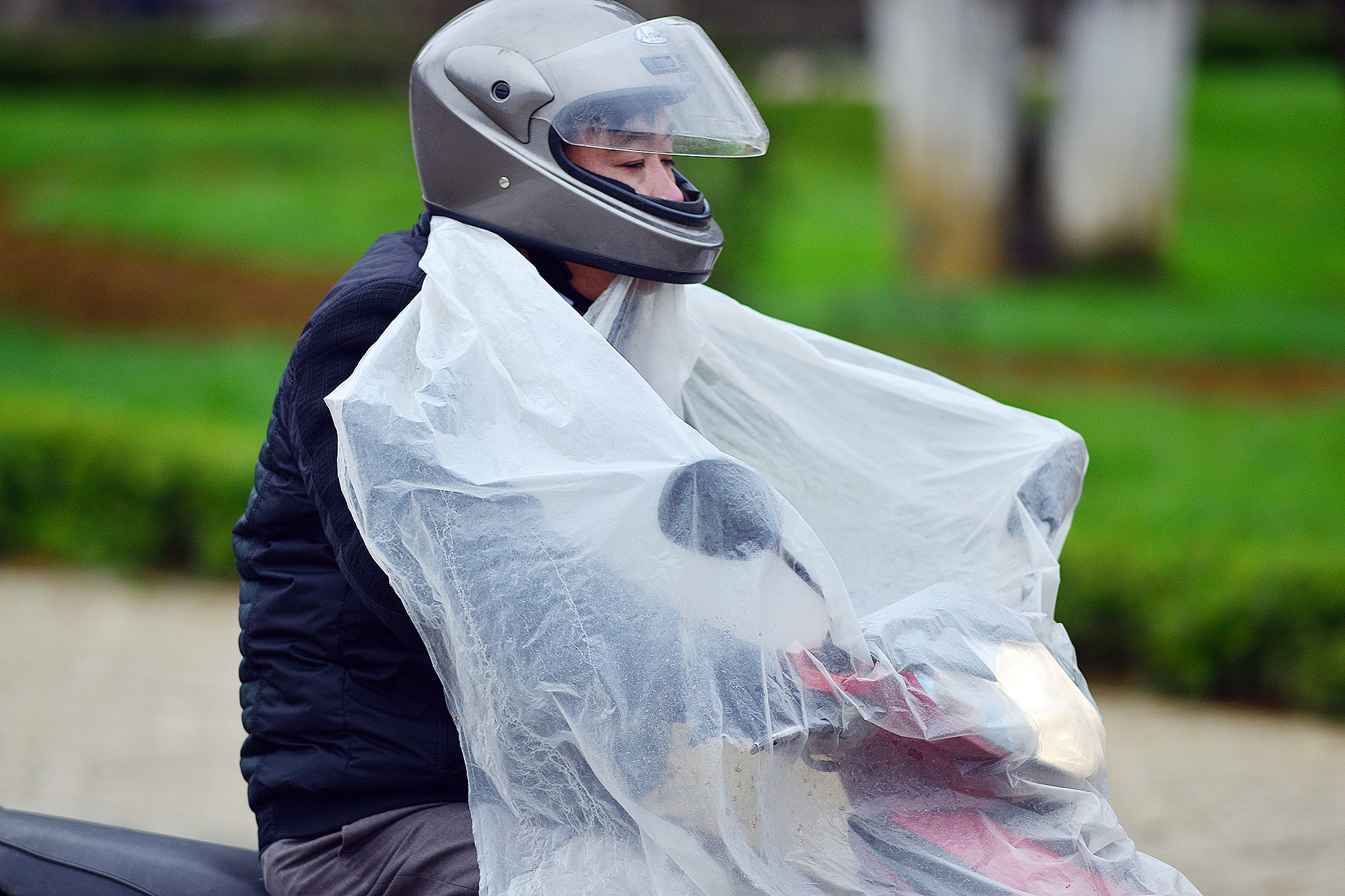 | Một số người đi xe máy phải khoác thêm áo mưa để chống lạnh. |