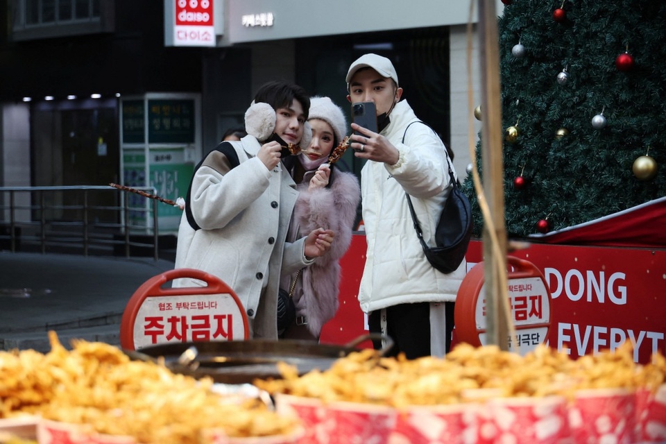 Khách du lịch Trung Quốc chụp ảnh bên quầy hàng rong ở khu mua sắm Myeongdong tại Seoul, Hàn Quốc. Ảnh: Reuters. |