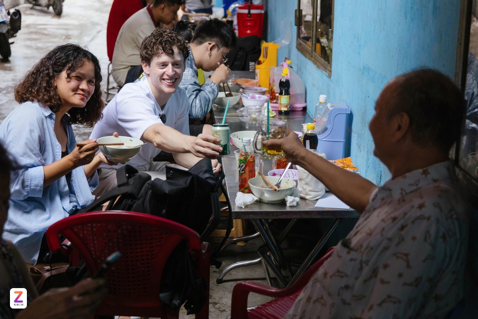 Du khách Stephen Turban, đến từ Mỹ, trải nghiệm ăn hủ tiếu thả dây, uống cà phê vợt ở TP.HCM, tháng 8/2024. Ảnh: Phương Lâm. |