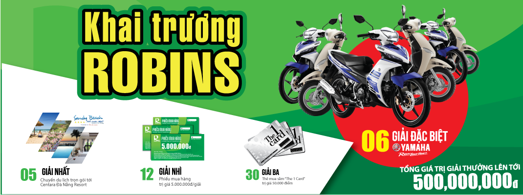 Với mỗi 200.000 đồng mua sắm tại Robins, bạn sẽ nhận được một phiếu thăm may mắn để tham gia chương trình rút thăm trúng thưởng cùng Robins với tổng giá trị lên đến 500 triệu đồng gồm có: