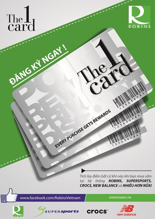 The 1 Card là chương trình thành viên giúp khách hàng thu thập điểm thưởng tại trung tâm mua sắm Robins cùng một lọạt các cửa hàng Supersports, Crocs & New Balance tại Hà Nội. Điểm có thể được tích lũy và đổi với giảm giá trực tiếp, quà tặng và nhiều ưu đãi khác.