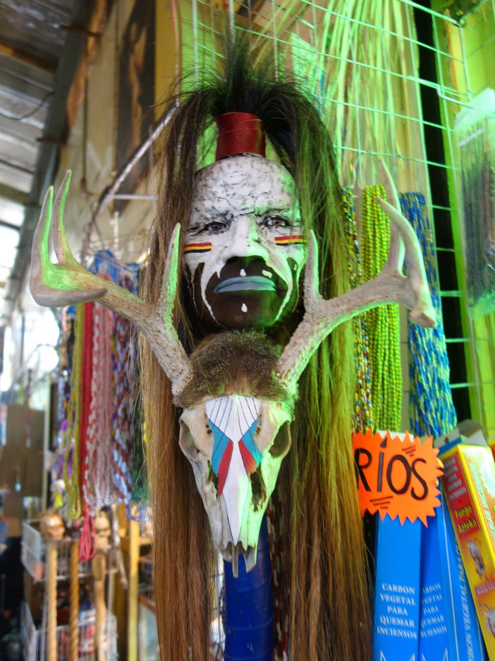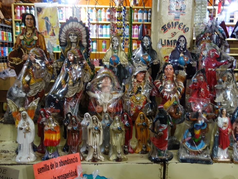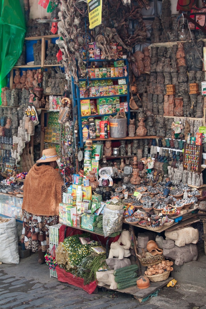 | Những bức tượng đầy màu sắc của các vị thần Inca được xếp ngay hàng thẳng lối ở các cửa hàng cũng như các gói hương, bùa hộ mệnh, nến và những chiếc lọ chứa chất lỏng bao gồm các loại thảo mộc khô, rượu và đôi lúc phần còn lại của hỗn hợp này có chứa cả chất của động vật để sử dụng trong các nghi lễ. |