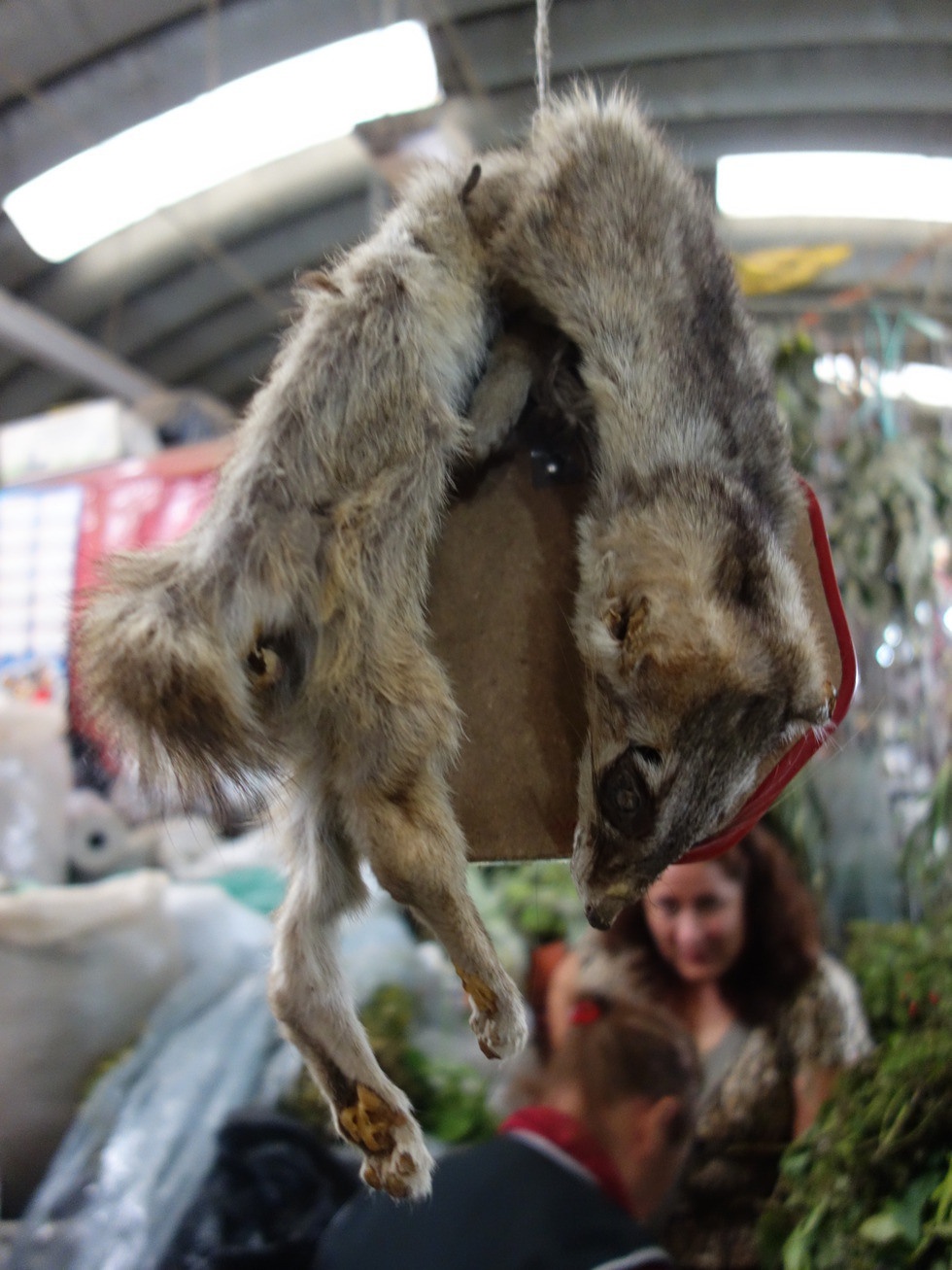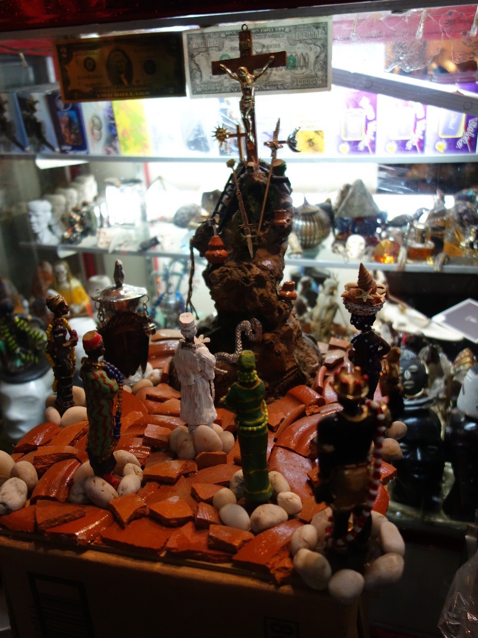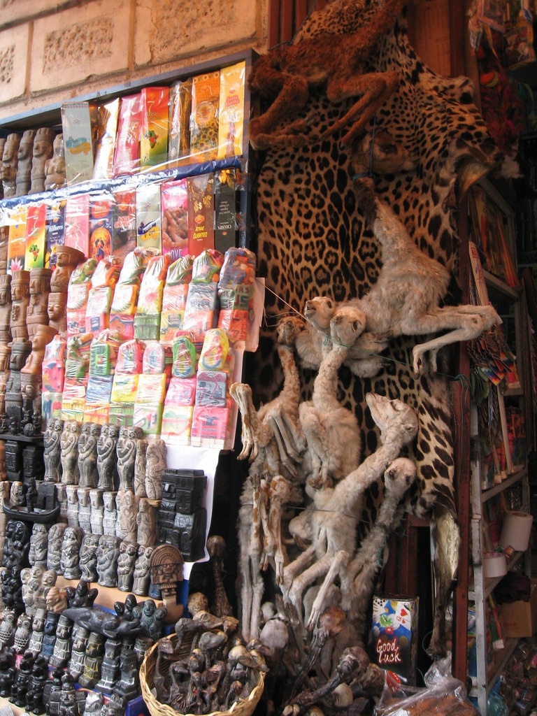 | Nhiều đầu động vật khô vẫn còn dính da, những vật thờ tế lớn thường được sử dụng trong các nghi lễ gia đình. Chủ sở hữu những món hàng bày bán ở đây cho rằng các loài động vật không bị giết trực tiếp để tế lễ, chúng được sử dụng trở lại khi đã bị chết trước đó, nguồn cung cấp từ những công viên quốc gia hay một nơi nào khác ở khu vực châu Phi. |