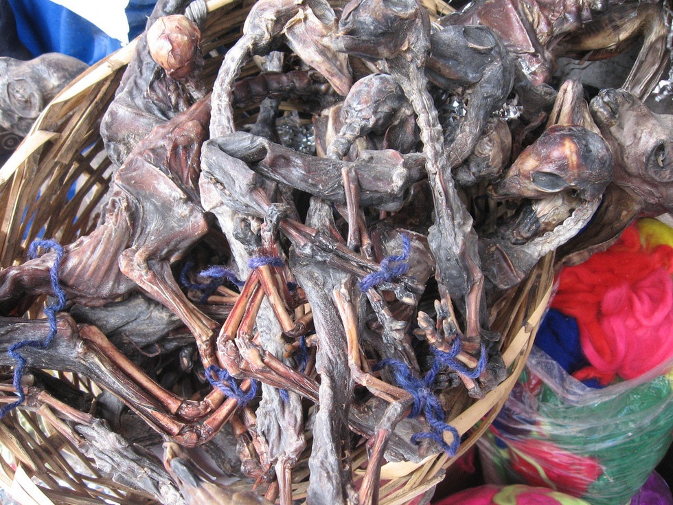 | Mỡ rắn như một loại thuốc chữa bệnh viêm khớp. Ếch pha trộn trong một ly sinh tố sẽ cải thiện bệnh thiếu máu. Cây nến hình người màu đen là nam hay nữ khi đốt lên sẽ mang ý nghĩa chia lìa, nghĩa là khi đốt cây nến mang giới tính màu đen lên, nó sẽ lái mối quan hệ giữa hai người từng yêu nhau tách ra. Những chiếc lá coca dành cho việc xem quẻ... Đây chỉ là một ít trong số các món hàng mà bạn có thể tìm thấy ở khu chợ Brujas ở Lima, Peru. |
