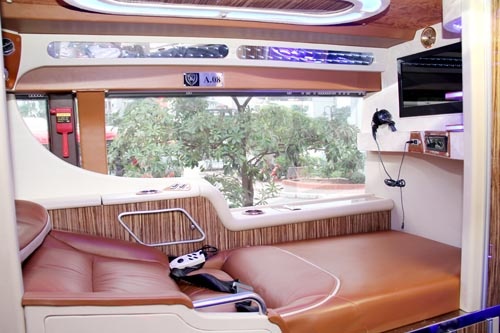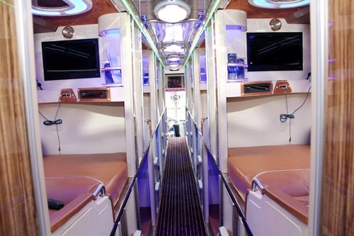 | Xe có 2 ghế và 20 giường được bọc da, rộng rãi, có thể điều chỉnh ngả lưng. Những chiếc giường này có tích hợp chức năng massage. |