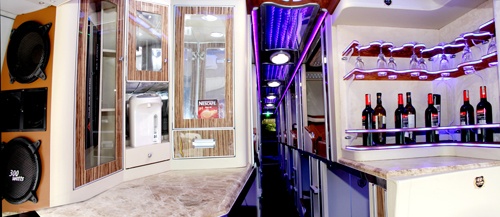 | Nội thất trong xe còn được trang bị những thiết bị tiện nghi khác như tủ lạnh, tủ rượu, tivi LED 16 inch, ổ cứng lưu phim ảnh và các chương trình ca nhạc, giải trí... cùng hệ thống âm thanh, tai nghe cao cấp. |