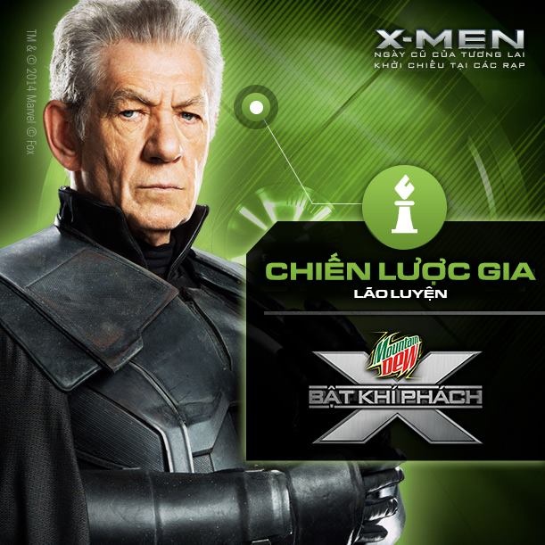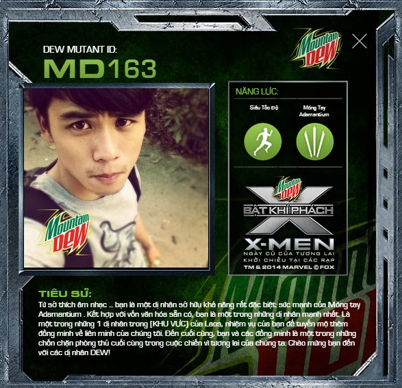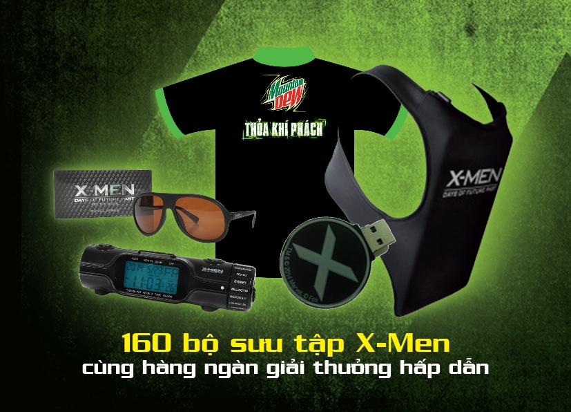 Hai là khi đến thưởng thức siêu phẩm X-Men: Ngày cũ của tương lai tại các rạp chiếu từ ngày công chiếu phim 23/5, hãy để khí phách X của bạn có cơ hội trỗi dậy và trải nghiệm thực tế bằng một loạt các thử thách vô cùng hấp dẫn, một New X-Men được chứng nhận bởi cộng đồng Dew Dudes và Mountain Dew sẽ là bạn.