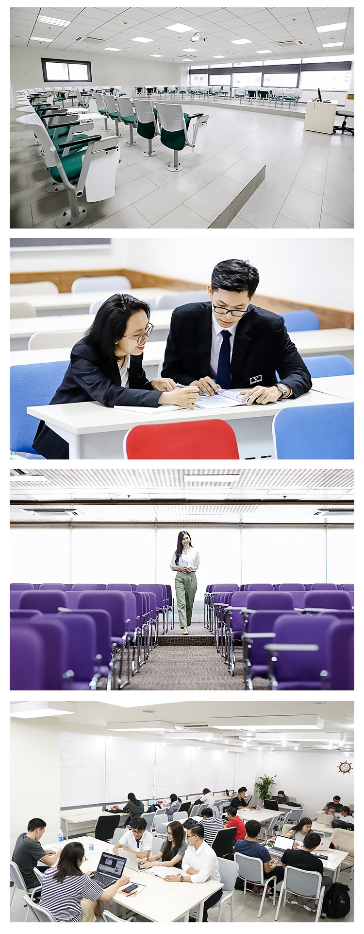 Bước vào tất cả lớp học tại Đại học Hoa Sen, có thể nhận ra giảng đường được xây dựng theo mô hình không bục giảng. Bàn ghế được kê theo hình chữ U quanh lớp học để sinh viên tương tác hiệu quả với giảng viên.
