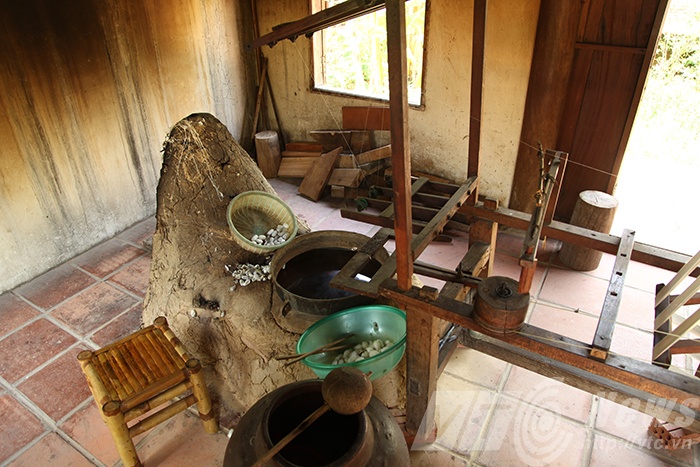 | Những ngôi nhà xưa cổ cùng công đoạn dệt lụa truyền thống. |