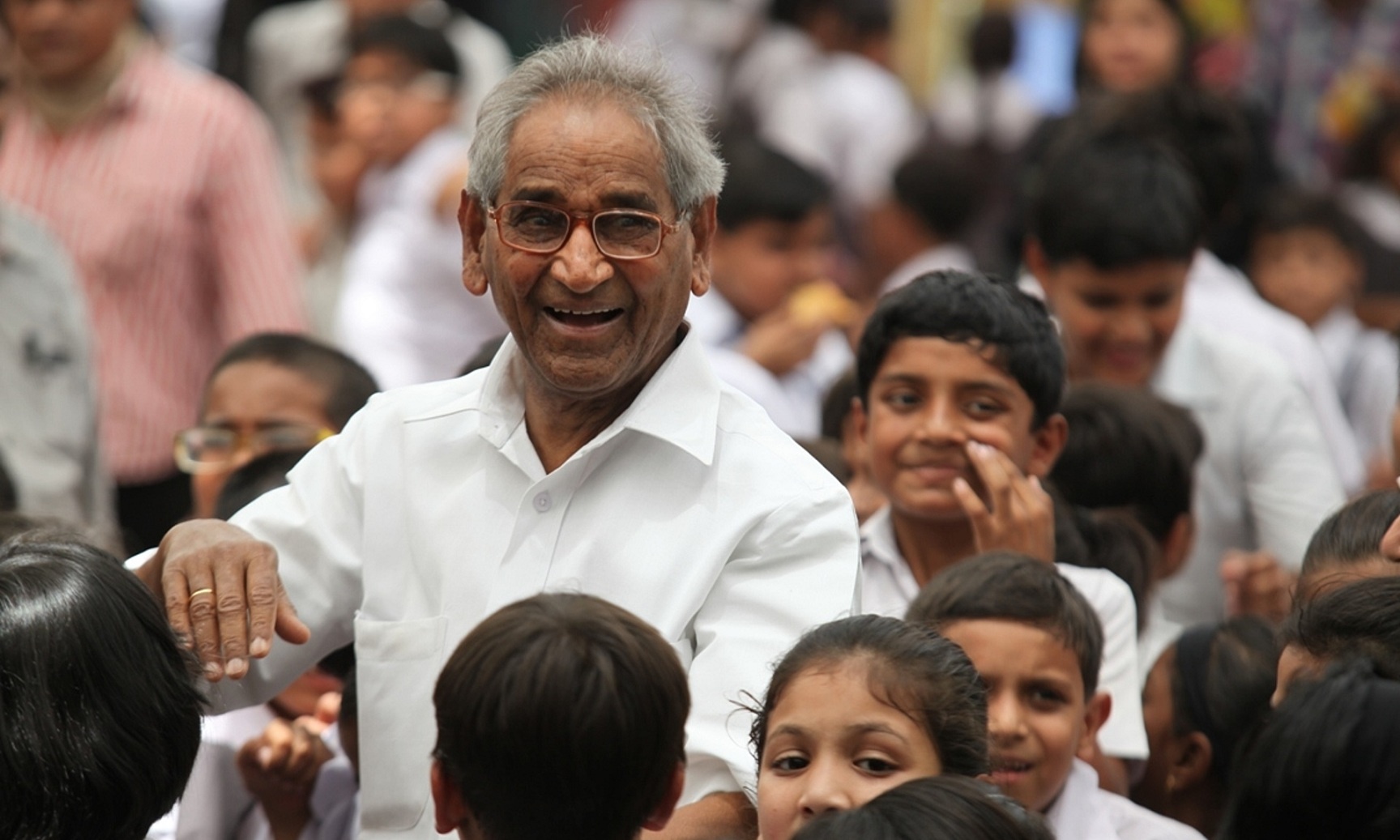 | Hai nhà đồng sáng lập CMS Jagdish Gandhi và Bharti Gandh chụp ảnh lưu niệm trước tòa nhà chính tại cơ sở Gomti Nagar. Đằng sau họ là câu nói nổi tiếng của Bahá’u’lláh, cha đẻ của đạo Bahá'í: "The Earth is but one country and mankind its citizens" (Trái đất là một quốc gia với công dân là toàn thể nhân loại). Vì thế, trường City Montessori rất chú trọng công tác bảo vệ môi trường. Ảnh: Bahainews. |