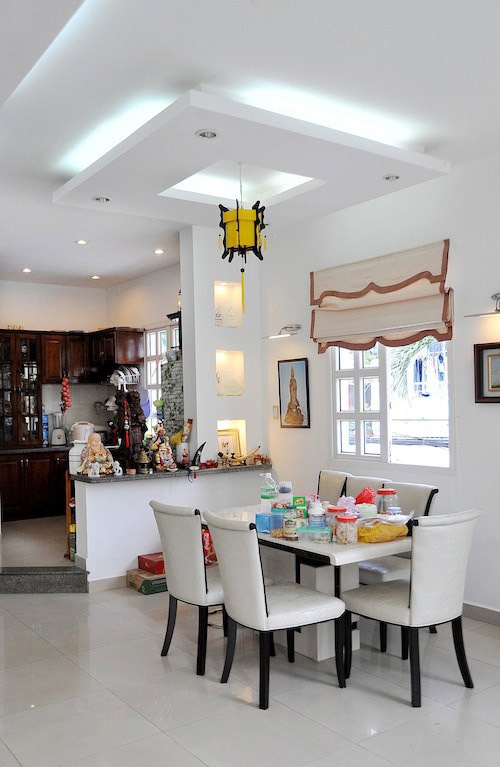 | Cũng tương tự như phòng khách, không gian nhà bếp và bàn ăn của gia đình Nhật Cường là tổ hợp của những sắc trắng, vàng... dịu nhẹ nhưng ấm cúng và sạch sẽ. Nhật Cường chọn phong cách đơn giản, nhẹ nhàng cho toàn bộ căn nhà. |