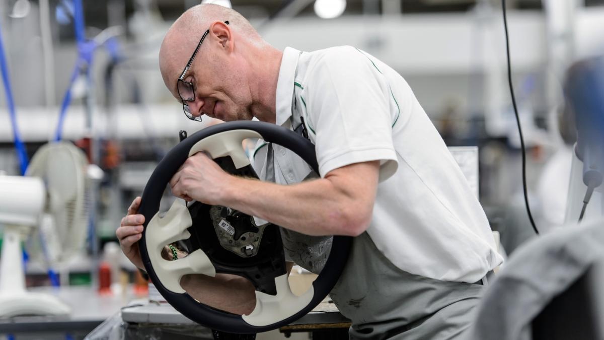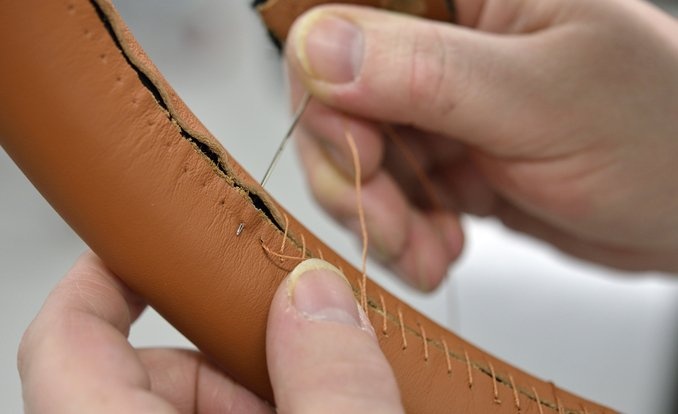 | Quá trình bọc da cho vô lăng cũng được hoàn thiện thủ công, bởi những người thợ lành nghề và có tay nghề cao. Những người thợ dùng nhiều loại công cụ khác nhau đề hoàn thành công đoạn này, thậm chí dùng cả những chiếc dĩa ăn. |