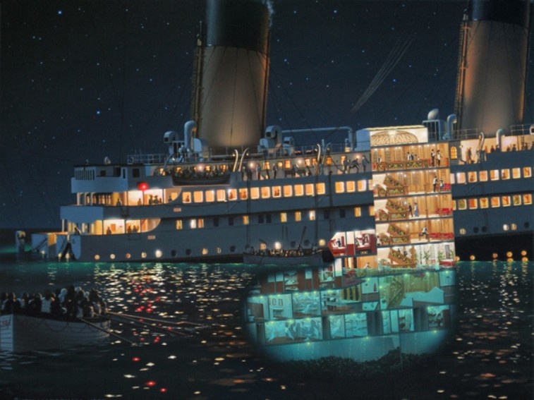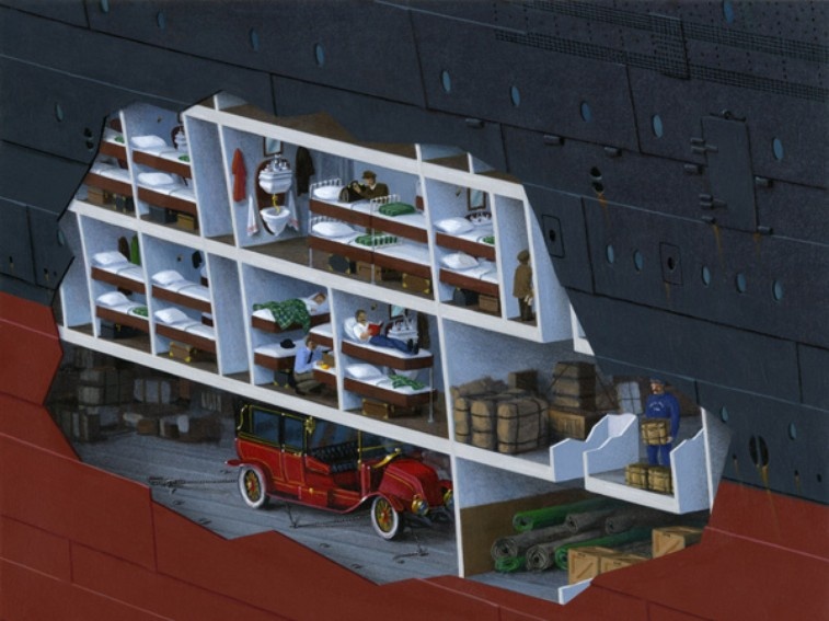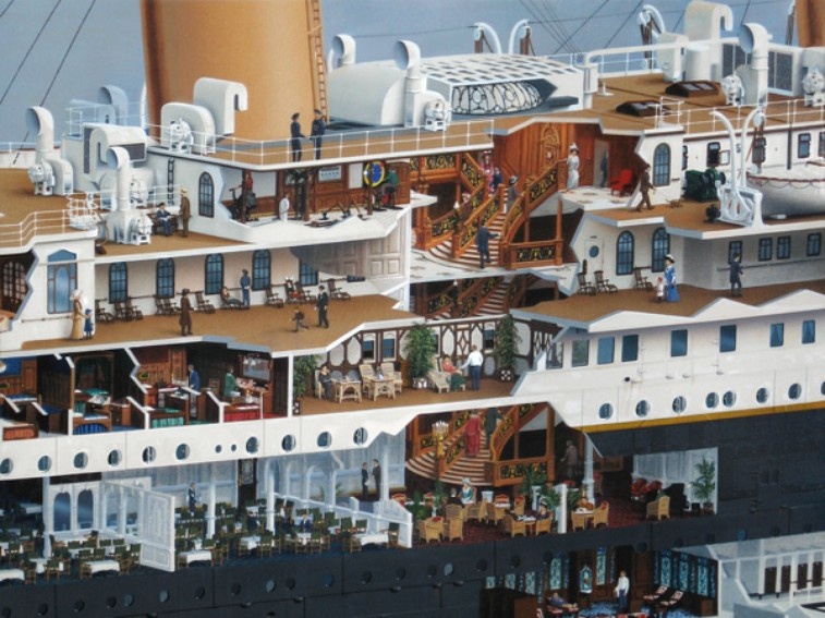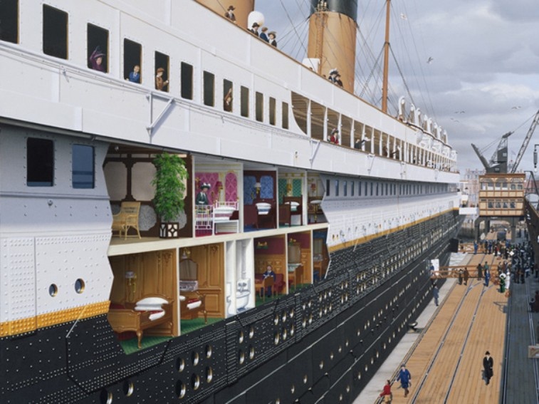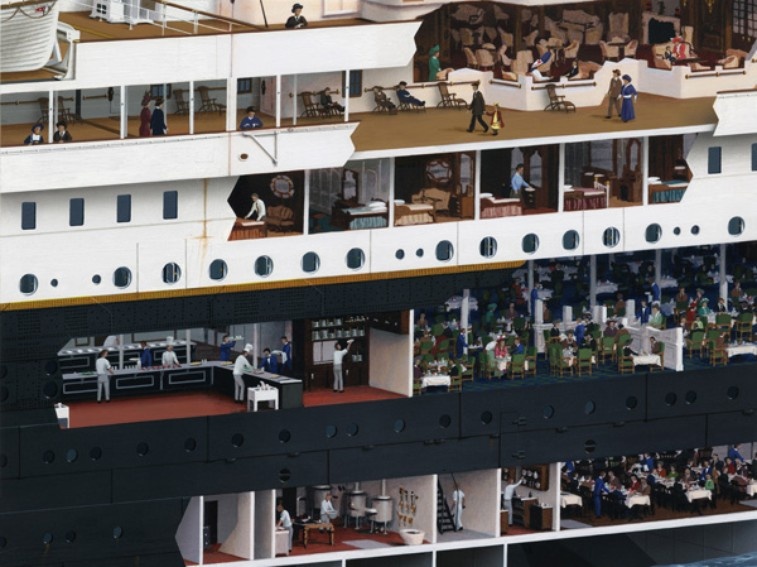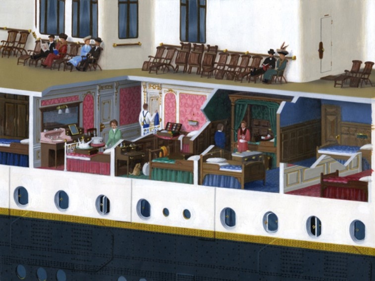 Trong cuốn sách Bên trong tàu Titanic, họa sĩ Ken Marschall đã mô phỏng nội thất của con tàu huyền thoại. Tác phẩm của Marschall hướng tới chi tiết và tỷ lệ. Nó là những lát cắt giúp người xem hình dung chính xác về “thành phố nổi” Titanic. |