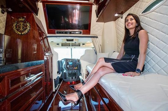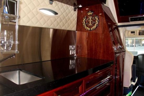 | Xe được ví như “lâu đài di động” khi được bổ sung rất nhiều trang thiết bị hiện đại như khoang lái với ghế và ốp cửa bọc da màu trắng sang trọng. Tựa đầu ghế có hình thêu bằng sợi chỉ vàng. Tổng số mũi khâu bằng chỉ vàng lên đến 72.000 mũi. |