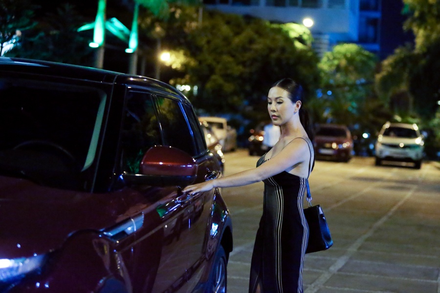 | Thu Hoài cũng đảm nhận vai trò người mẫu màn giới thiệu bộ sưu tập áo dài của NTK Minh Châu. Xuất hiện nổi bật ở khu vực đỗ xe, người đẹp U40 diện váy quây khoe vóc dáng và vai trần gợi cảm. Hoa hậu phu nhân tự cần lái chiếc xe Range Rover màu đỏ bóc-đô trị giá khoảng 3 tỷ đồng. |