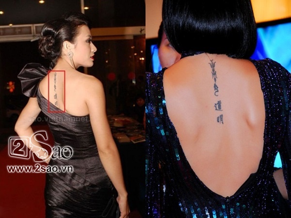 | Hình xăm sau lưng của Ngô Thanh Vân mang ý nghĩa tâm linh như một tấm bùa hộ mệnh bảo vệ chủ nhân. Đây là một kiểu xăm bùa của Thái Lan. |