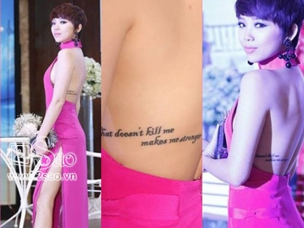 | Sau một cú sốc về tinh thần, Tóc Tiên thay đổi hoàn toàn từ một cô bé tóc dài trở thành một cô nàng tóc ngắn cá tính, quyến rũ. Hình xăm ở vùng lưng eo “What doesn’t kill me makes me stronger”(Những gì không làm tôi gục ngã sẽ khiến tôi mạnh mẽ hơn hơn) như một châm ngôn sống của người đẹp này. |