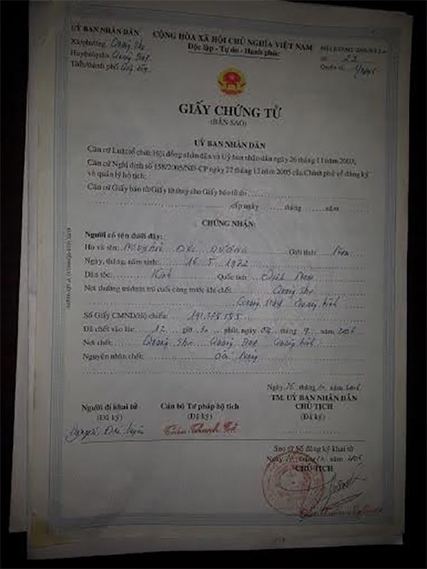 | Giấy chứng tử mang tên Nguyễn Đức Dương do Trung tâm Y tế dự phòng huyện Quảng Trạch cấp. |