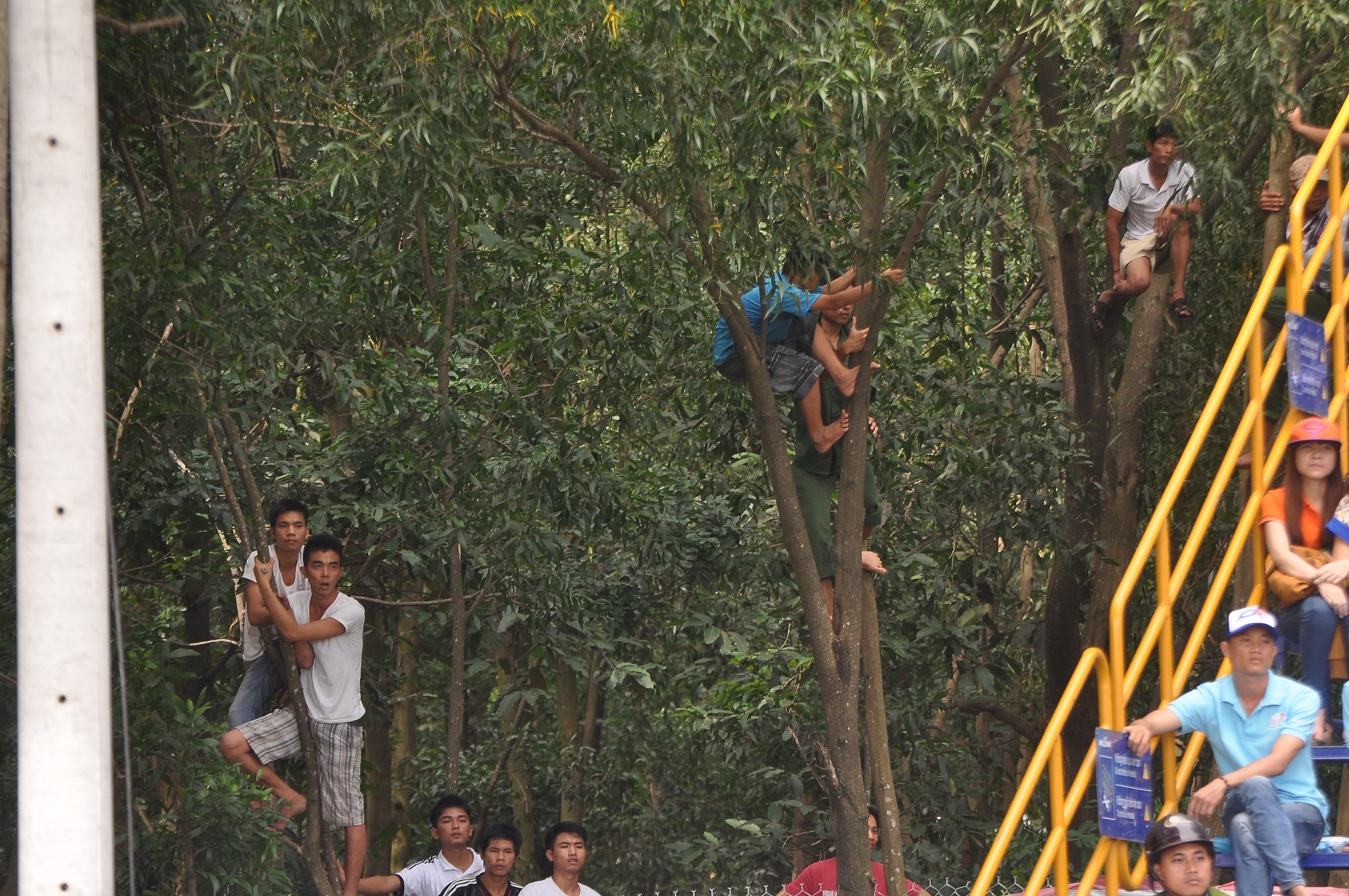 | Rất nhiều người leo cao đến hơn 10m trên cây sau lưng khán đài B để xem như thế này. |