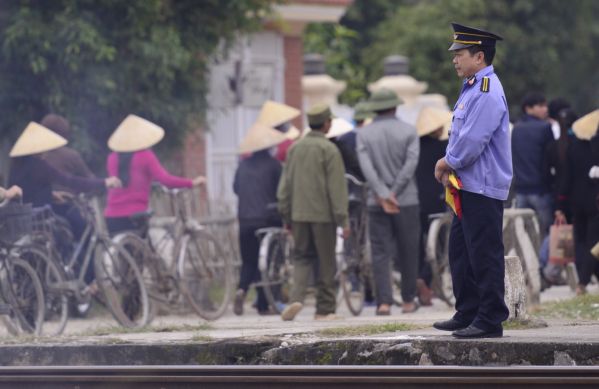 | Người gác tàu ga Yên Thái lặng lẽ đứng một góc khi từng đám ma đi qua. Ông cho biết, do con đường đến nghĩa trang đi qua đường tàu nên hôm nay sẽ đứng gác cả ngày để đảm bảo an toàn cho mọi người. |