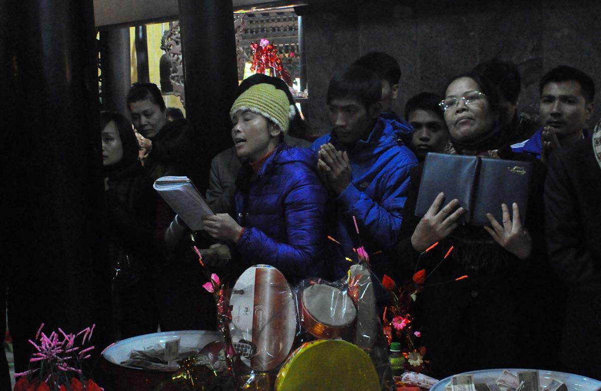 Ngoài những người “khấn thuê” chen chân được vào vị trí đẹp thì còn rất nhiều “cò” khác lảng vảng xung quanh nơi làm lễ với chiếc đĩa và hai đồng tiền Âm - Dương trên tay chào mời khách hành hương. Họ vừa đi vừa nói: “Đặt một hai đồng lẻ sẽ khấn xin lộc, vay tiền may cả năm”.