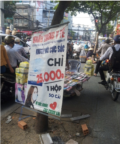Gần đây TP.HCM xuất hiện những bảng hiệu quảng cáo khẩu trang y tế dọc vỉa hè khắp Sài gòn. Trước đây nếu mua khẩu trang y tế tại các nhà thuốc giá từ 2.000 đồng/cái. Hiện tại, khẩu trang y tế ở lề đường bán giá sốc 25.000 đồng/hộp/50 cái. Tính ra thì mỗi cái khẩu trang chỉ có giá 500 đồng chưa kể đến người bán đã có phần lời trong đó.