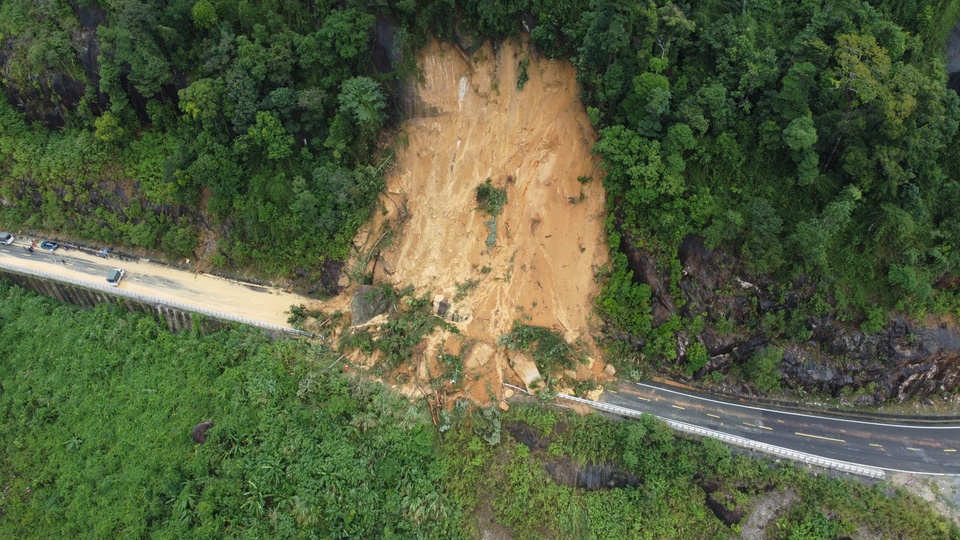 Một điểm sạt lở nghiêm trọng trên đèo Khánh Lê gây chia cắt mặt đường, ngày 18/11. Ảnh: Phùng Quang/Tiền Phong. |