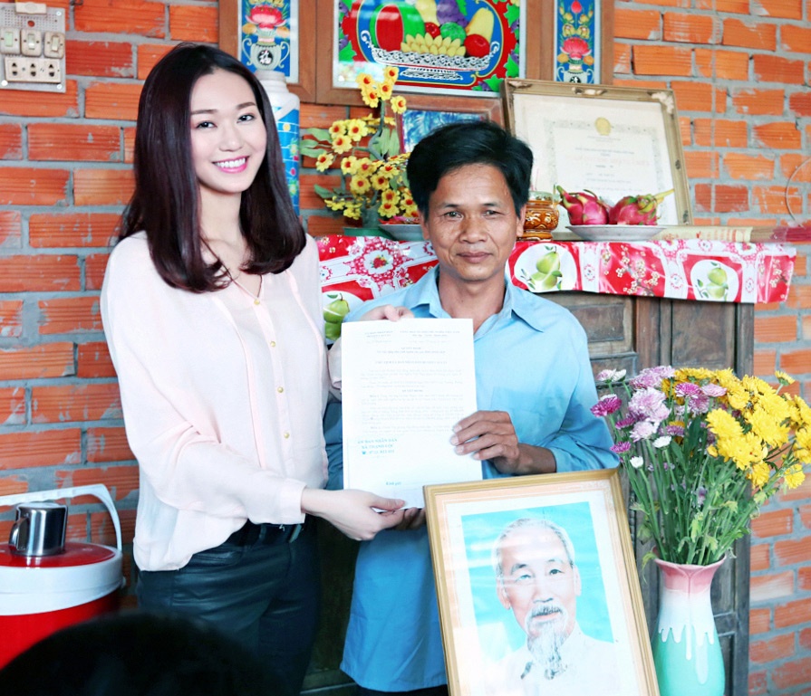Mới đây, Khánh My có chuyến về Tiền Giang trao nhà tình nghĩa cho 2 cặp vợ chồng mù. Người đẹp đội nắng, đi xe máy đến thăm hỏi những người có hoàn cảnh khó khăn.