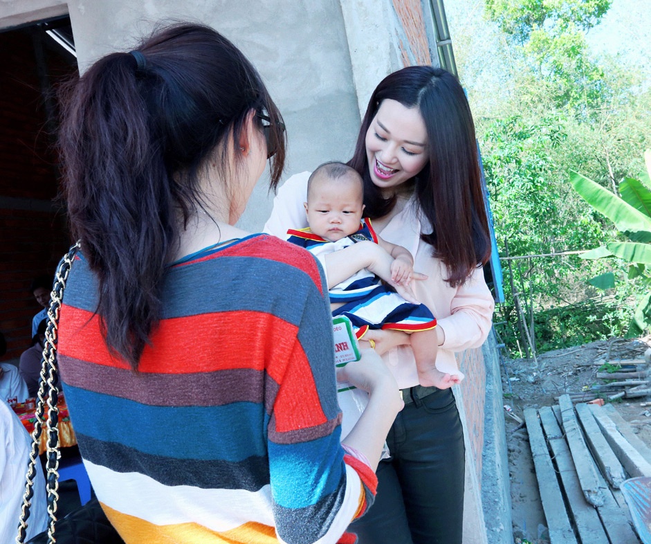 | Khánh My tỏ ra thân thiện khi ẵm, nô đùa với những em nhỏ. Ngoài đóng phim, Khánh My chia sẻ còn thử sức ở lĩnh vực kinh doanh để kinh tế ổn định, yên tâm hoạt động nghệ thuật. |