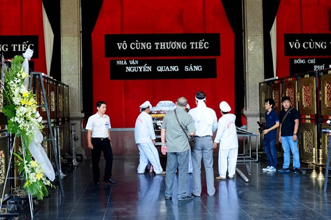 | Từ sáng sớm, gia đình cố nhà văn Nguyễn Quang Sáng đã có mặt tại nhà tang lễ Lê Quý Đôn - Quận 3 - TP.HCM để chuẩn bị cho lễ viếng. |